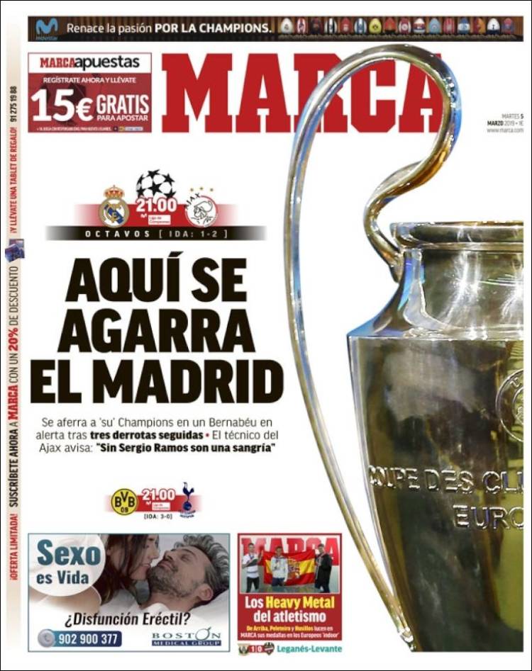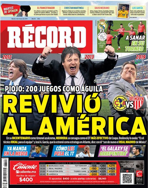 Roma se encuentra interesado por Federico Chiesa, jugador que actualmente milita en la Fiorentina. (Corriere dello Sport) El Porto enfrentará a la Roma en Champions con su arsenal más caro en la plantilla. (O Jogo) El Real Madrid se encuentra en problemas de acuerdo a las declaraciones de Luka Modric. (Mundo Deportivo) El Real Madrid se aferra a la Champions a pesar de los recientes fracasos en la Copa del Rey y Liga. (Marca) El Real Madrid buscará avanzar en Champions sin su capitán Sergio Ramos. (As) Cristiano Ronaldo parece haber cambiado el futuro de Massimiliano Allegri como técnico de la Juventus. (Tuttosport) Después de 17 años Ricardo La Volpe regresó a Toluca como técnico. (Esto) La cláusula de rescisión de Joao Félix podría llegar a los 200 millones de euros. (Record) Frenkie de Jong buscará ser una barrera para el Real Madrid en el Bernabéu. (Sport) Toluca fichó a un técnico que desde el 2006 no gana ni la mitad de los puntos disputados. (Cancha) Defensa y Justicia sigue sumando victorias en la Superliga de Argentina. (Olé) Joao Félix es un fenómeno con la elástica del Benfica. (A Bola) El América parece haber despertado en el actual torneo. (Récord)Relacionado