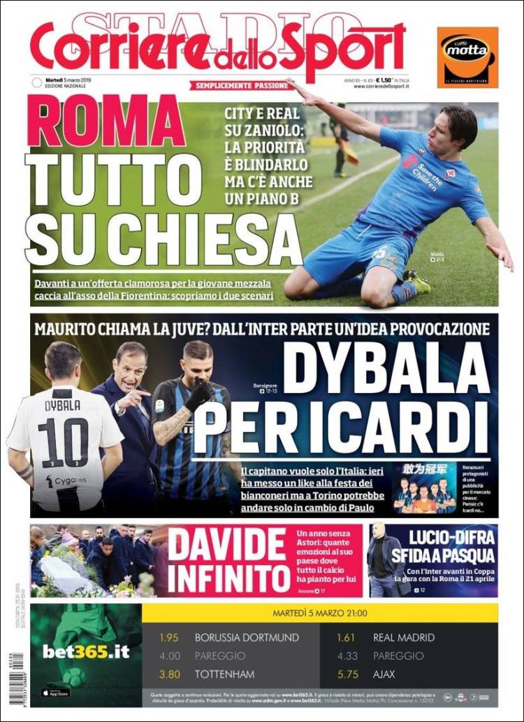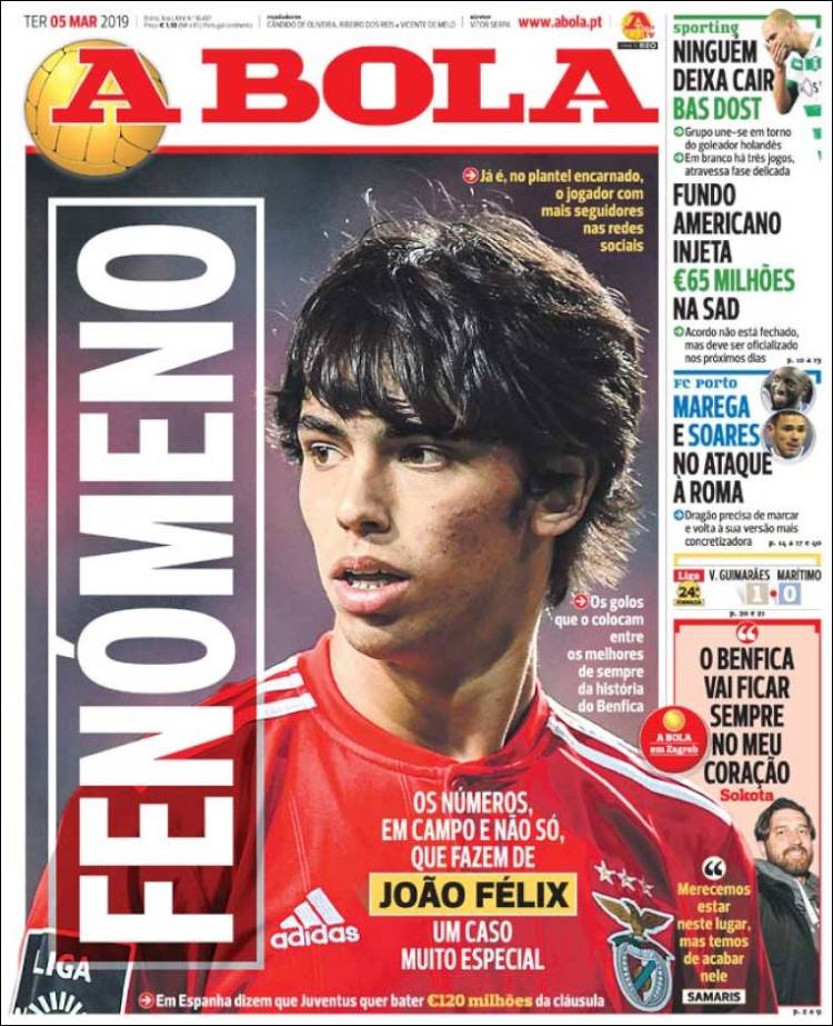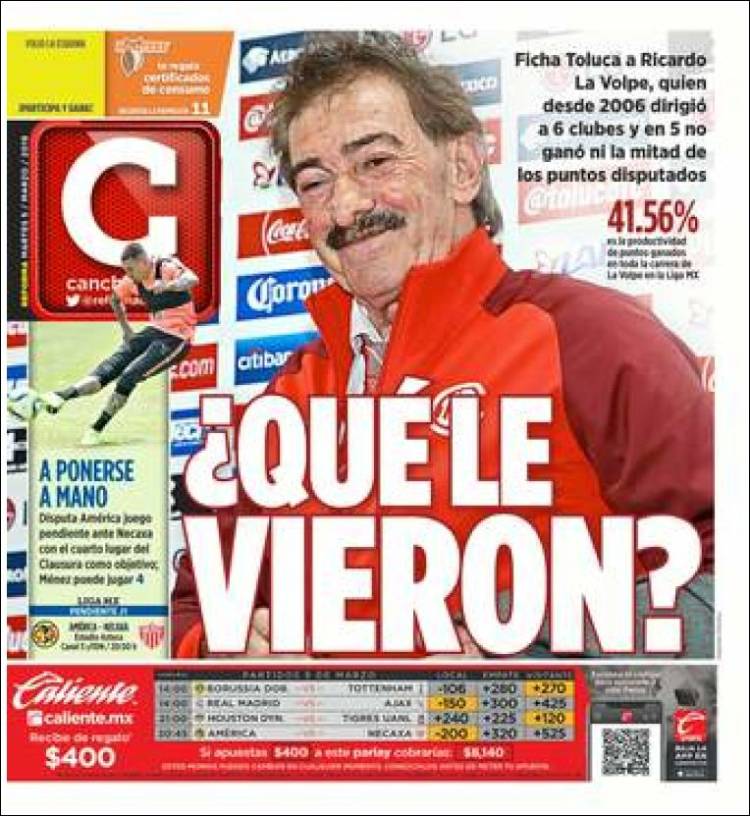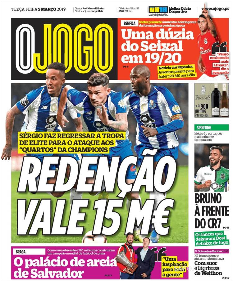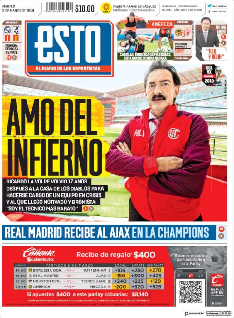 Roma se encuentra interesado por Federico Chiesa, jugador que actualmente milita en la Fiorentina. (Corriere dello Sport) El Porto enfrentará a la Roma en Champions con su arsenal más caro en la plantilla. (O Jogo) El Real Madrid se encuentra en problemas de acuerdo a las declaraciones de Luka Modric. (Mundo Deportivo) El Real Madrid se aferra a la Champions a pesar de los recientes fracasos en la Copa del Rey y Liga. (Marca) El Real Madrid buscará avanzar en Champions sin su capitán Sergio Ramos. (As) Cristiano Ronaldo parece haber cambiado el futuro de Massimiliano Allegri como técnico de la Juventus. (Tuttosport) Después de 17 años Ricardo La Volpe regresó a Toluca como técnico. (Esto) La cláusula de rescisión de Joao Félix podría llegar a los 200 millones de euros. (Record) Frenkie de Jong buscará ser una barrera para el Real Madrid en el Bernabéu. (Sport) Toluca fichó a un técnico que desde el 2006 no gana ni la mitad de los puntos disputados. (Cancha) Defensa y Justicia sigue sumando victorias en la Superliga de Argentina. (Olé) Joao Félix es un fenómeno con la elástica del Benfica. (A Bola) El América parece haber despertado en el actual torneo. (Récord)Relacionado