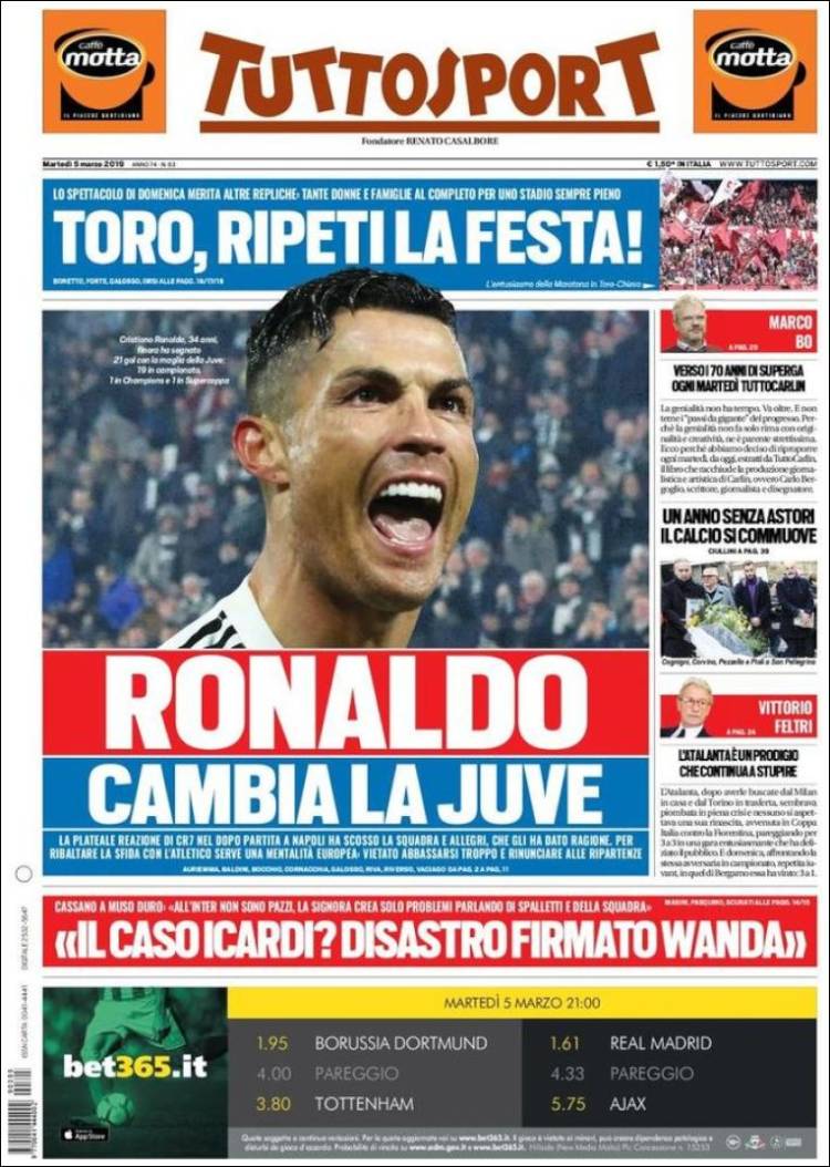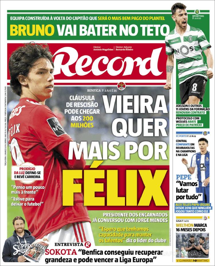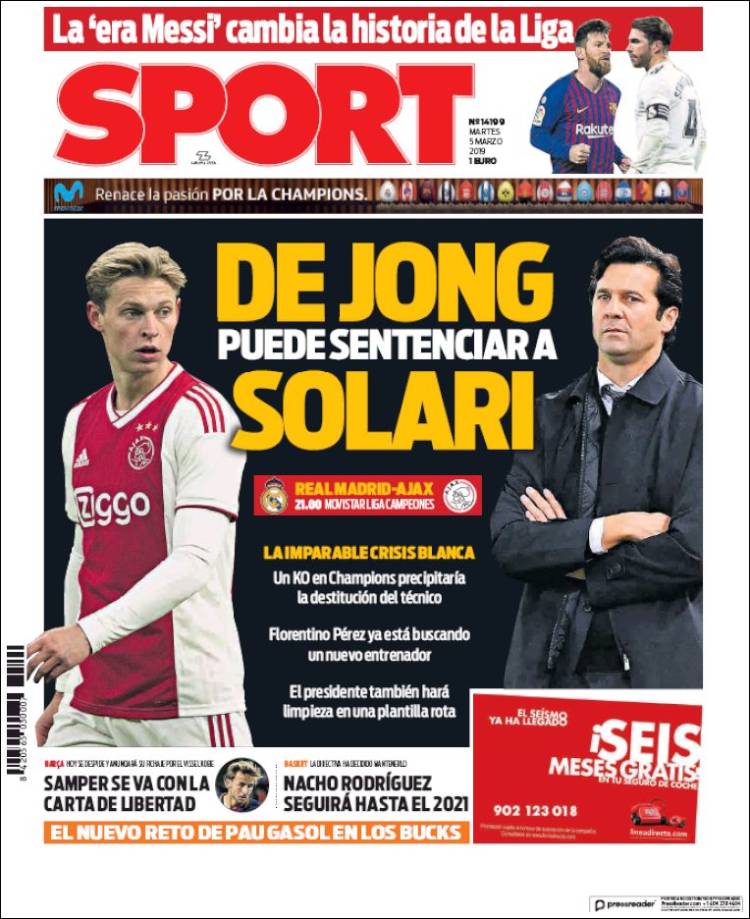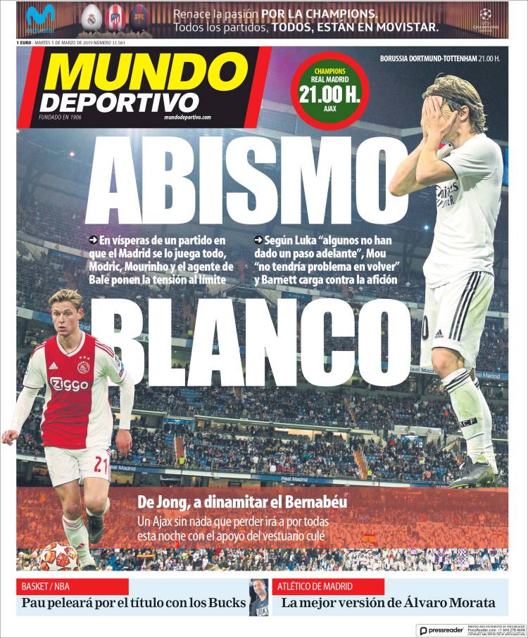 Roma se encuentra interesado por Federico Chiesa, jugador que actualmente milita en la Fiorentina. (Corriere dello Sport) El Porto enfrentará a la Roma en Champions con su arsenal más caro en la plantilla. (O Jogo) El Real Madrid se encuentra en problemas de acuerdo a las declaraciones de Luka Modric. (Mundo Deportivo) El Real Madrid se aferra a la Champions a pesar de los recientes fracasos en la Copa del Rey y Liga. (Marca) El Real Madrid buscará avanzar en Champions sin su capitán Sergio Ramos. (As) Cristiano Ronaldo parece haber cambiado el futuro de Massimiliano Allegri como técnico de la Juventus. (Tuttosport) Después de 17 años Ricardo La Volpe regresó a Toluca como técnico. (Esto) La cláusula de rescisión de Joao Félix podría llegar a los 200 millones de euros. (Record) Frenkie de Jong buscará ser una barrera para el Real Madrid en el Bernabéu. (Sport) Toluca fichó a un técnico que desde el 2006 no gana ni la mitad de los puntos disputados. (Cancha) Defensa y Justicia sigue sumando victorias en la Superliga de Argentina. (Olé) Joao Félix es un fenómeno con la elástica del Benfica. (A Bola) El América parece haber despertado en el actual torneo. (Récord)Relacionado