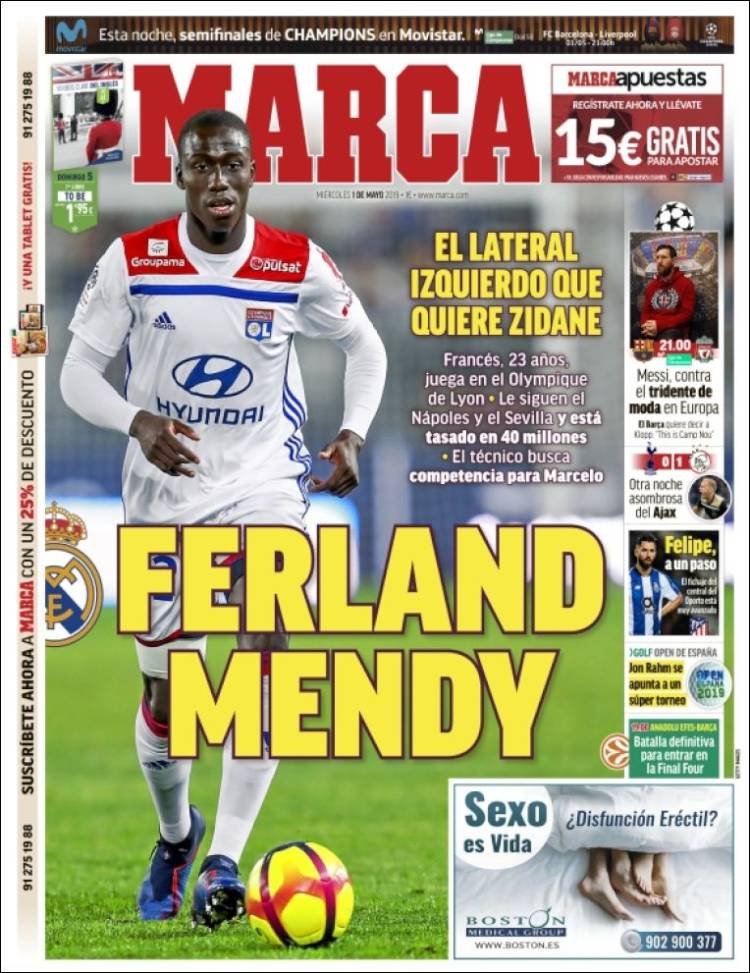 Ferland Mendy, lateral del Olympique de Lyon, es un jugador que quiere Zidane la próxima temporada. (Marca)