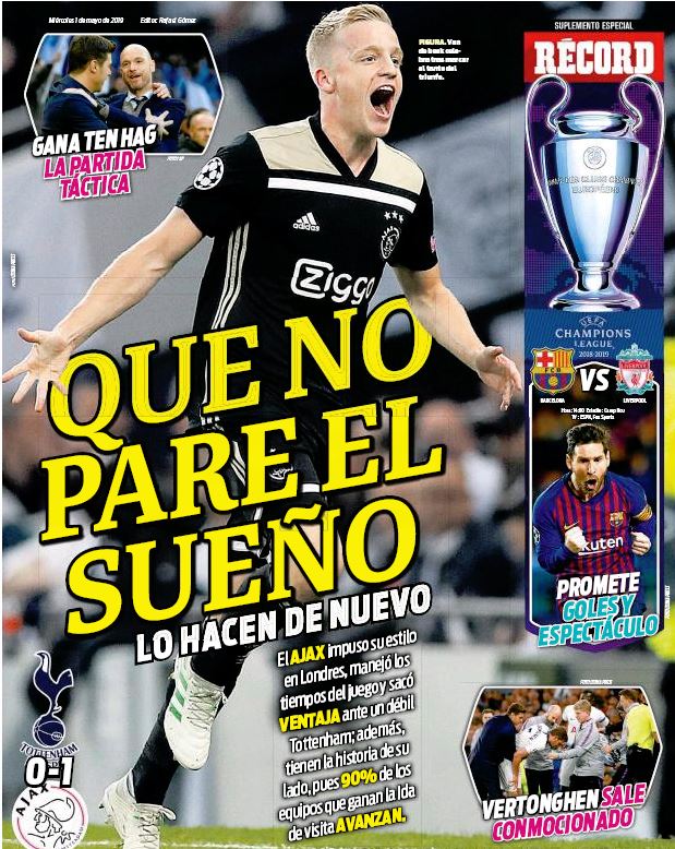 El Ajax sorprendió y venció al Tottenham en la semifinal de ida de la Champions League. (Récord)
