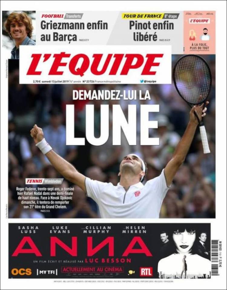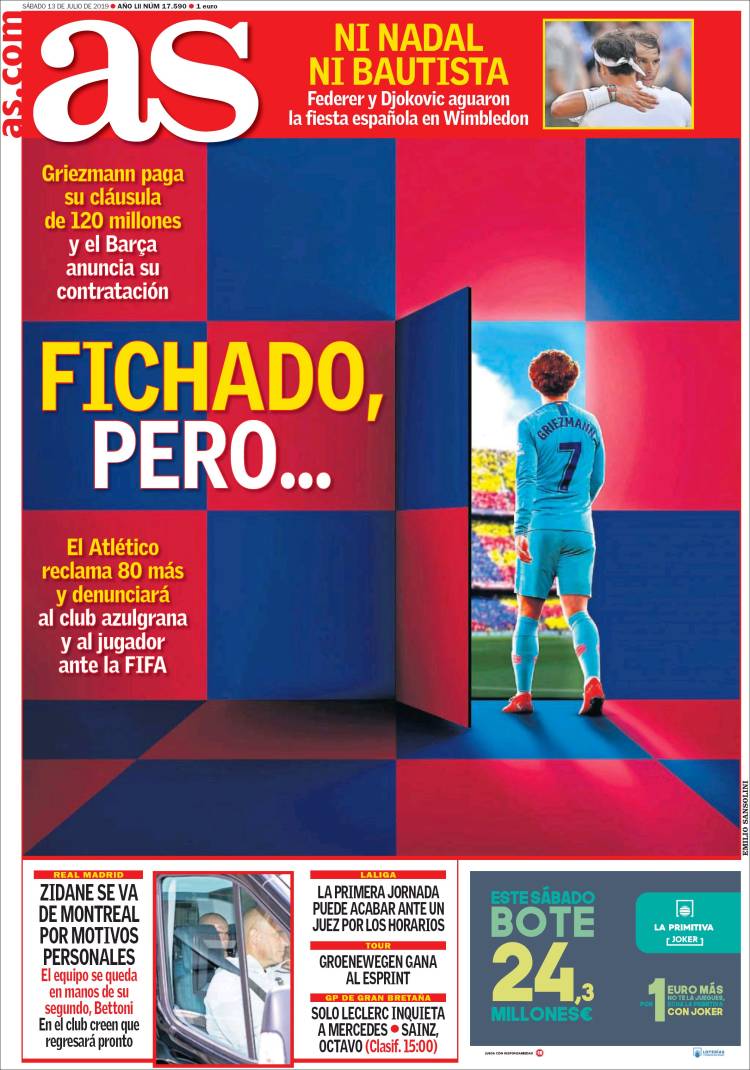 Estas son las portadas de los diarios deportivos del 13 de julio del 2019, donde destaca el fichaje de Antoine Griezmann con el Barcelona y la victoria de Roger Federer sobre Rafael Nadal para avanzar a la Final de Wimbledon, donde enfrentará a Novak Djokovic.