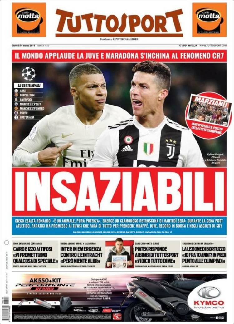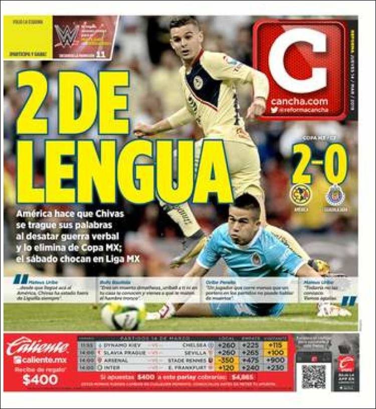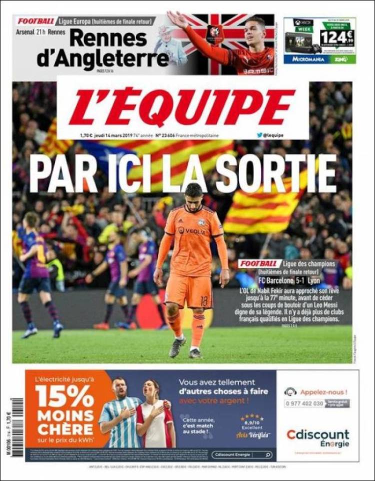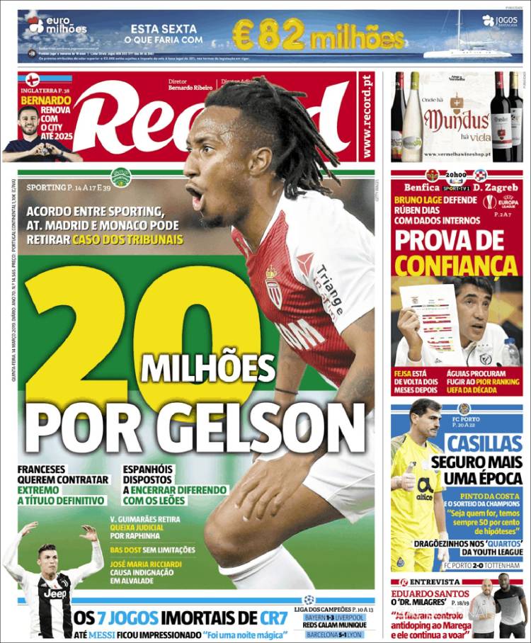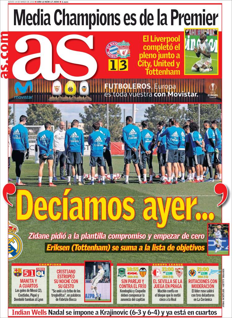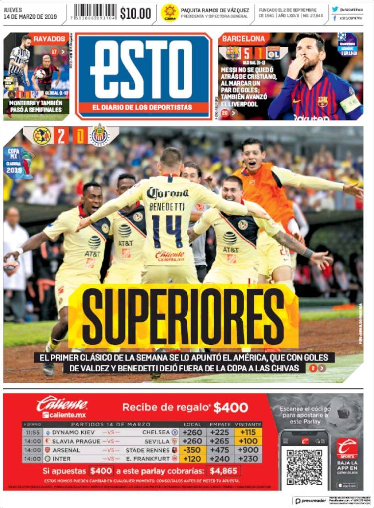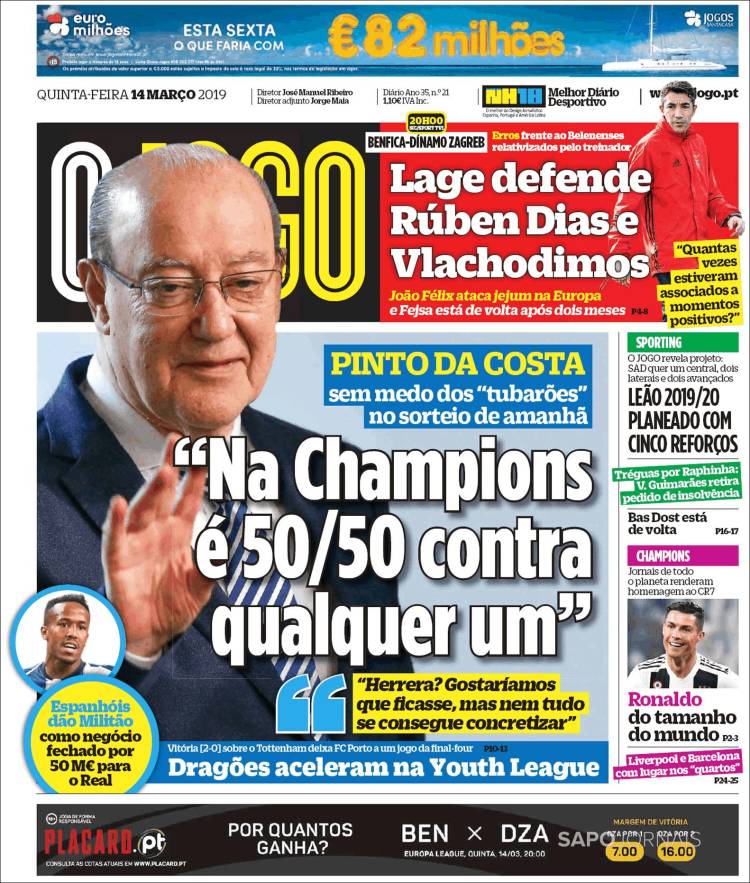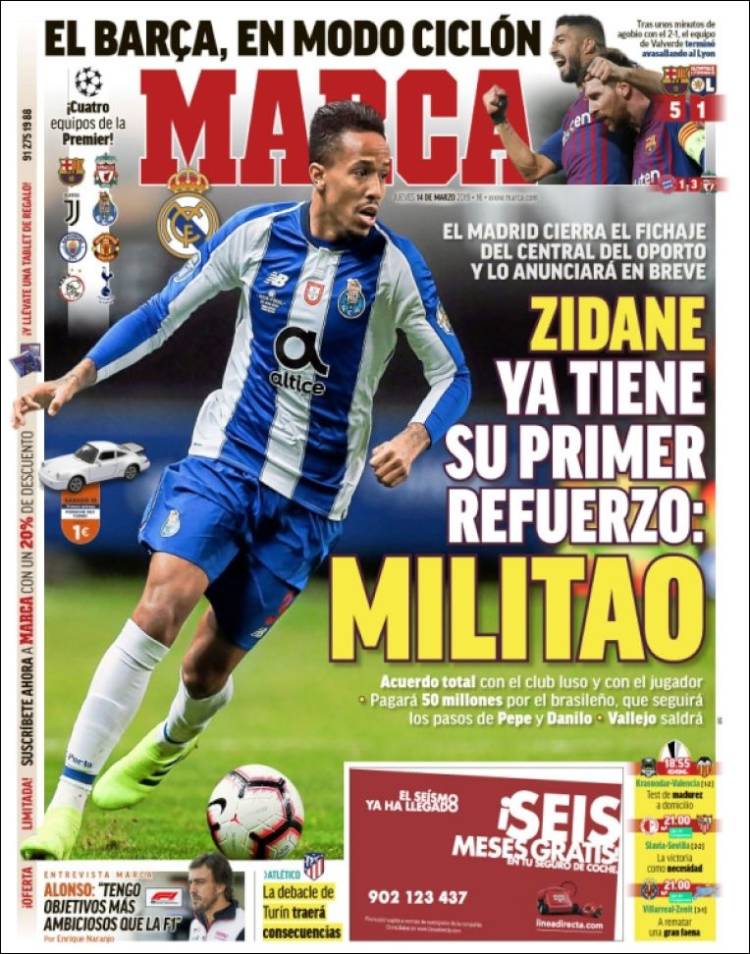 El Real Madrid fichó a Éder Militao, actual jugador del Porto. (Marca) El Olympique de Lyon fue eliminado de la Champions League tras ser goleado por el Barça. (L’Equipe) El Benfica buscará revertir el marcador global en su casa y avanzar a los Cuartos de Final de la Europa League. (A Bola) Diego Armando Maradona elogió el trabajo que ha hecho Cristiano Ronaldo con la Juventus. (Tuttosport) River Plate empató frente al Palestino de Chile en la Copa Libertadores. (Olé) Gelson Martins podría salir del Atlético de Madrid para fichar por el Mónaco. (Record) Los directivos del Porto no temen enfrentarse a mejores equipos en los Cuartos de Final de la Champions League. (O Jogo) A Messi le bastó 2 goles y 2 asistencias para eliminar al Olympique de Lyon de la Champions League. (Mundo Deportivo) América avanzó a las Semifinales de la Copa MX luego de vencer a Chivas en el ‘Clásico Nacional’. (Cancha) América venció a Chivas en los Cuartos de Final de la Copa MX. (Esto) Zinedine Zidane pidió compromiso a sus jugadores, en su primer entrenamiento con el Real Madrid. (As) El Barça volvió hacer de las suyas para avanzar a los Cuartos de Final de la Champions League. (Sport) Massimiliano Allegri disfruta del momento que está viviendo con la Juventus. (Corriere dello Sport)Relacionado