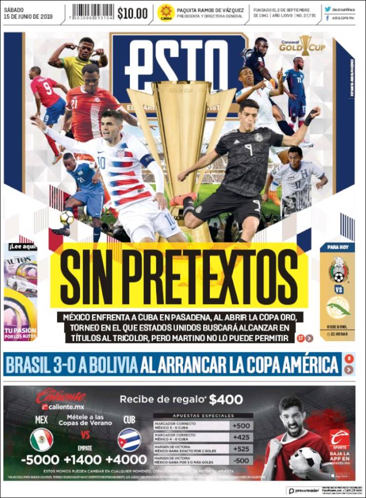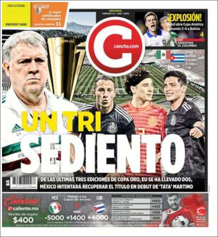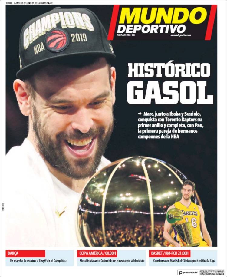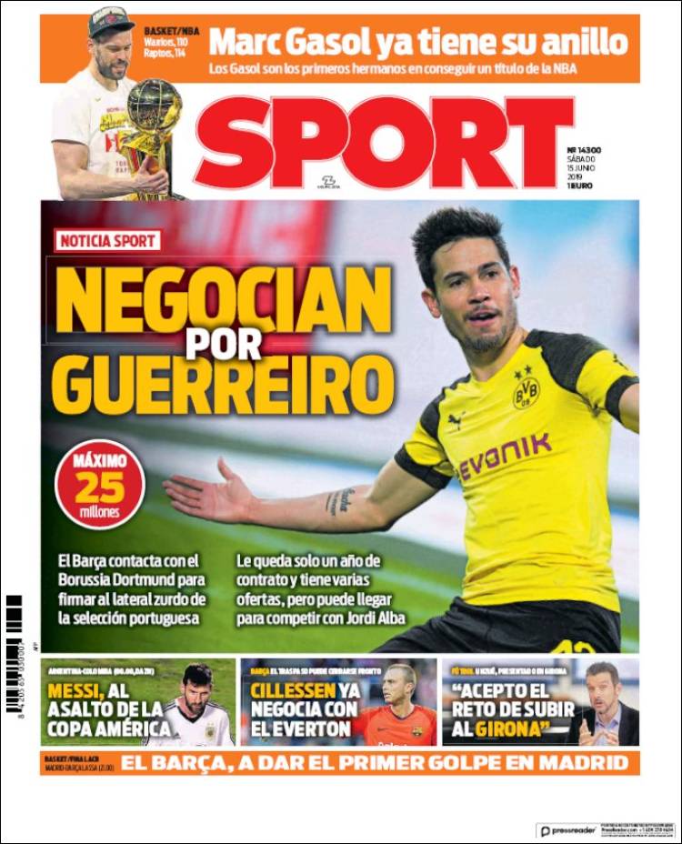 El Barça busca los servicios del portugués Raphaël Guerreiro. (Sport) Brasil debutó con goleada en la Copa América 2019. (Olé) Marc Gasol logró el título de la NBA. (Mundo Deportivo) Es la primera vez en la historia de la NBA que dos hermanos españoles han logrado coronarse en dicha liga. (Marca) Matías Vargas admitió el interés del Porto. (O Jogo) Fábio Cardoso y Guilherme Schettine se encuentran en el radar del Benfica. (Record) Andrea Pinamonti podría convertirse en nuevo jugador del Benfica. (A Bola) Maurizio Sarri sigue sonando con fuerza para llegar al banquillo de la Juventus. (Tuttosport) México se alista para su debut en la Copa Oro 2019. (Récord) Este diario dio a conocer los nombres de los mejores rugbistas de la actualidad. (L’Equipe) El ‘Tri’ no tendrá ningún pretexto para coronarse en la Copa Oro. (Esto) México debutará en Copa Oro enfrentando a Cuba. (Cancha)Relacionado