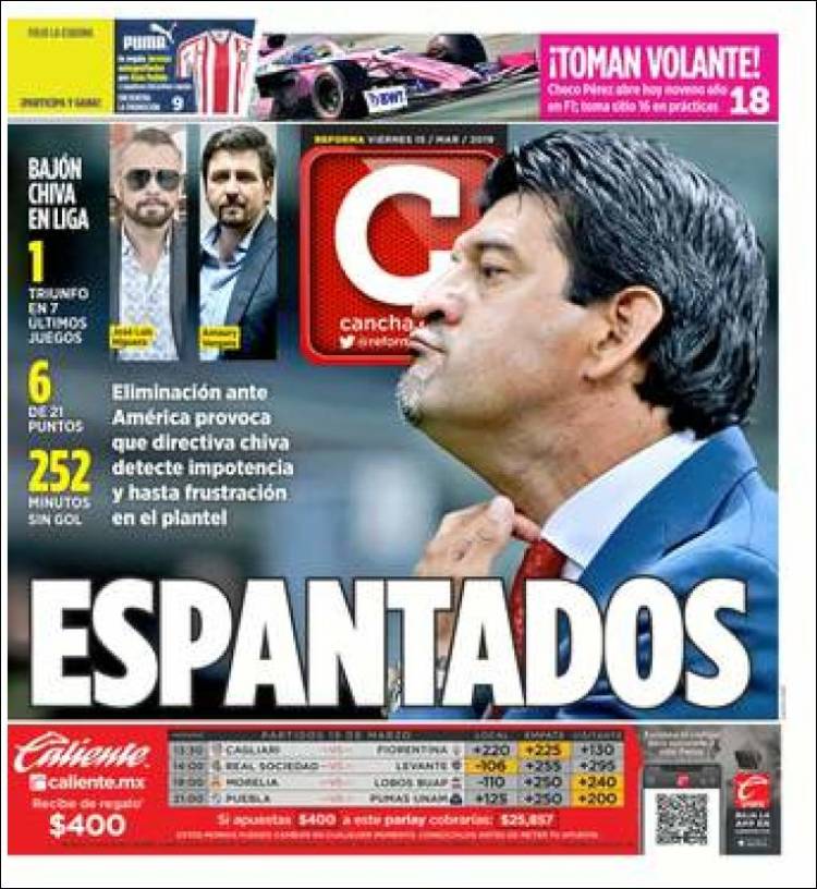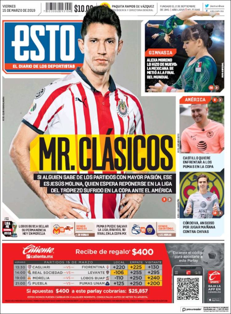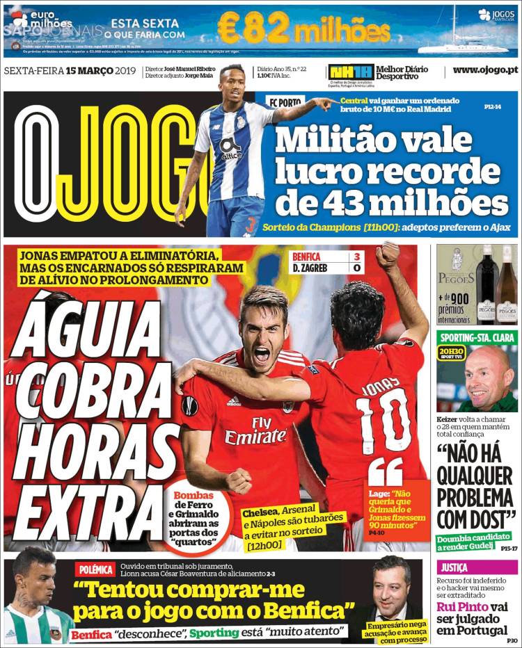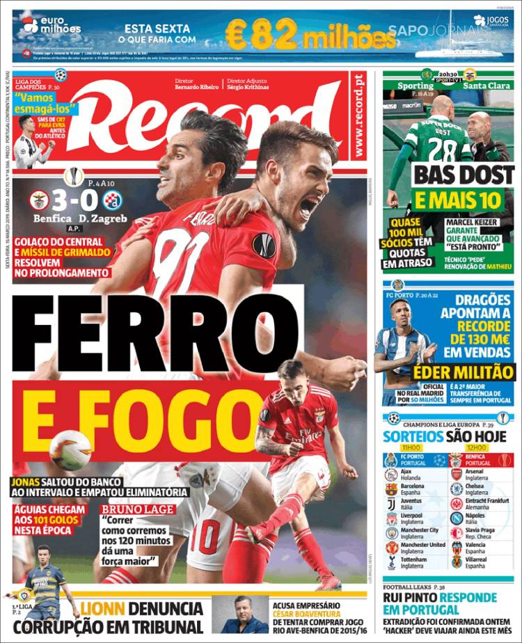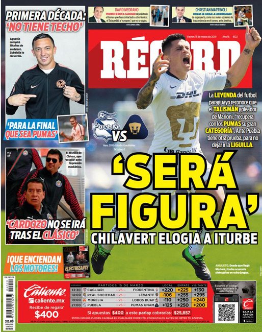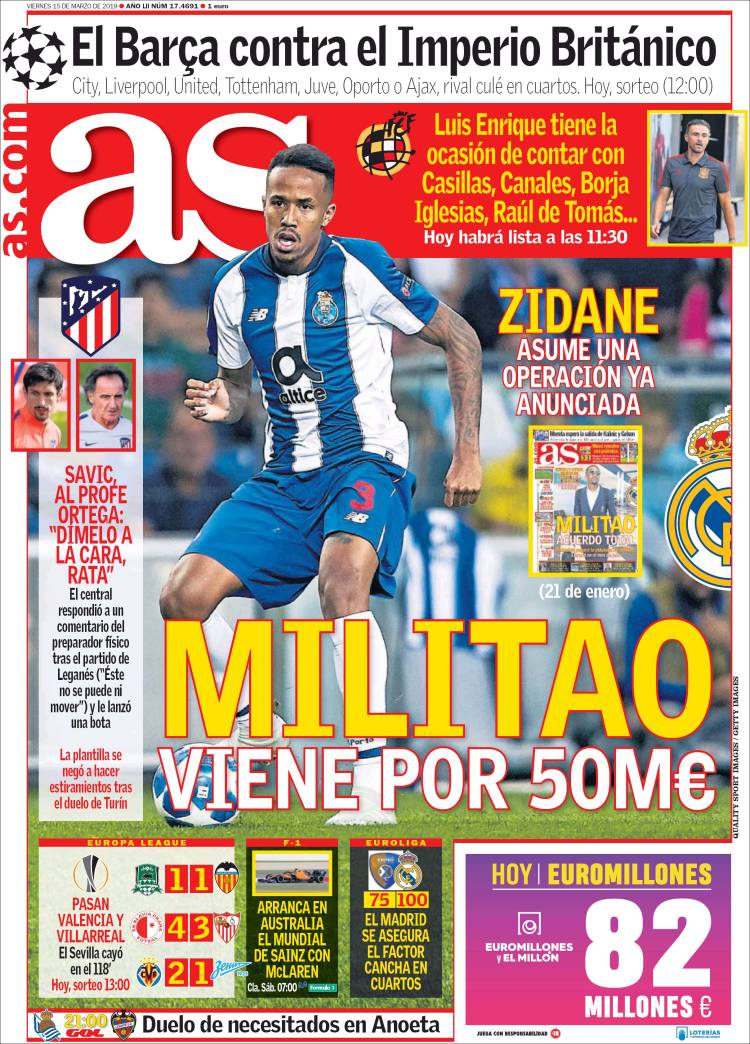 Éder Militao se convirtió en uno de los defensas más caros que ha fichado el Real Madrid. (Marca) El Rennes de Francia quedó eliminado de la Europa League tras caer en los Octavos de Final ante el Arsenal. (L’Equipe) Pumas visitará a Puebla este viernes para inaugurar la jornada 11 de la Liga MX. (Récord) El Inter de Milán quedó eliminado de la Europa League luego de perder frente al Eintracht Frankfurt. (Corriere dello Sport) Éder Militao fue fichado por el Real Madrid. (As) El Benfica continúa sorprendiendo en la Europa League. (A Bola) Cristiano Ronaldo no ha sido investigado por la UEFA, tras los insultos que le hizo a varios hinchas del ‘Atleti’. (Tuttosport) Luka Jović se ha convertido en la obsesión del Barça. (Sport) El Benfica goleó en su casa al Dinamo Zagreb en el juego de vuelta de los Octavos de Final de la Europa League. (Record) Fernando Gago dejó de pertenecer al Boca Juniors. (Olé) El Benfica logró avanzar a los Cuartos de Final de la Europa League. (O Jogo) Jesús Molina es el único jugador en Chivas que ha disputado varios Clásicos en el futbol mexicano. (Esto) La directiva y cuerpo técnico de Chivas se encuentran en una etapa de desesperación tras los malos resultados en Liga y Copa MX. (Cancha) Ousmane Dembélé podría tener actividad con el Barça en los Cuartos de Final de la Champions League. (Mundo Deportivo)Relacionado