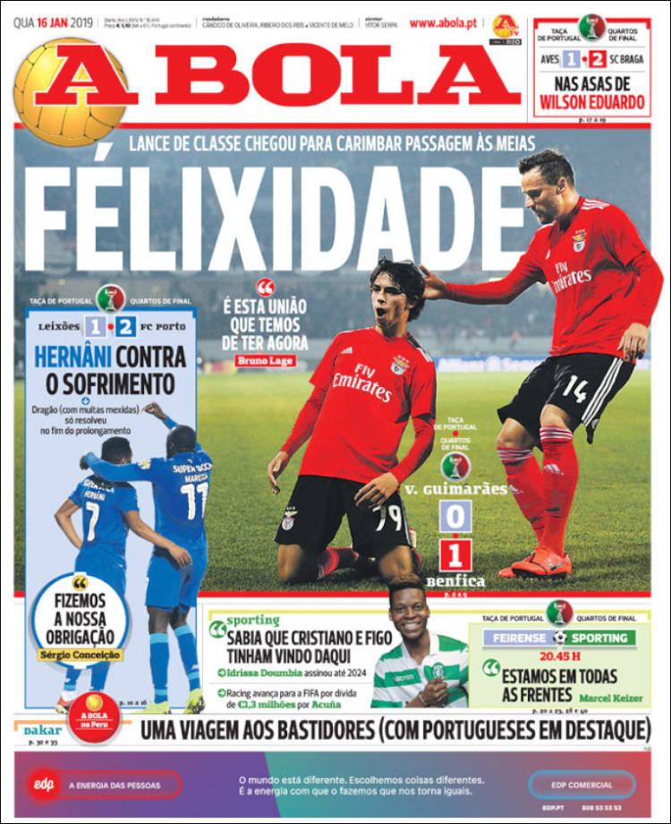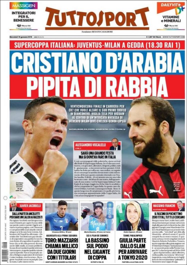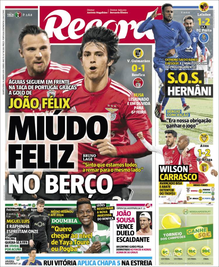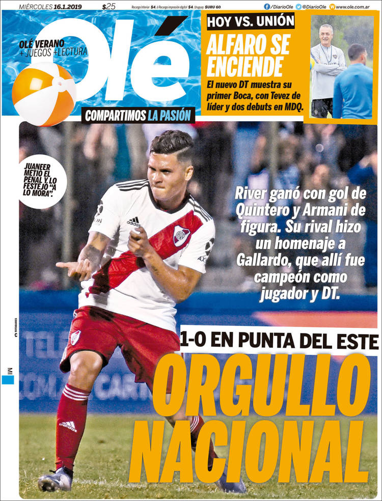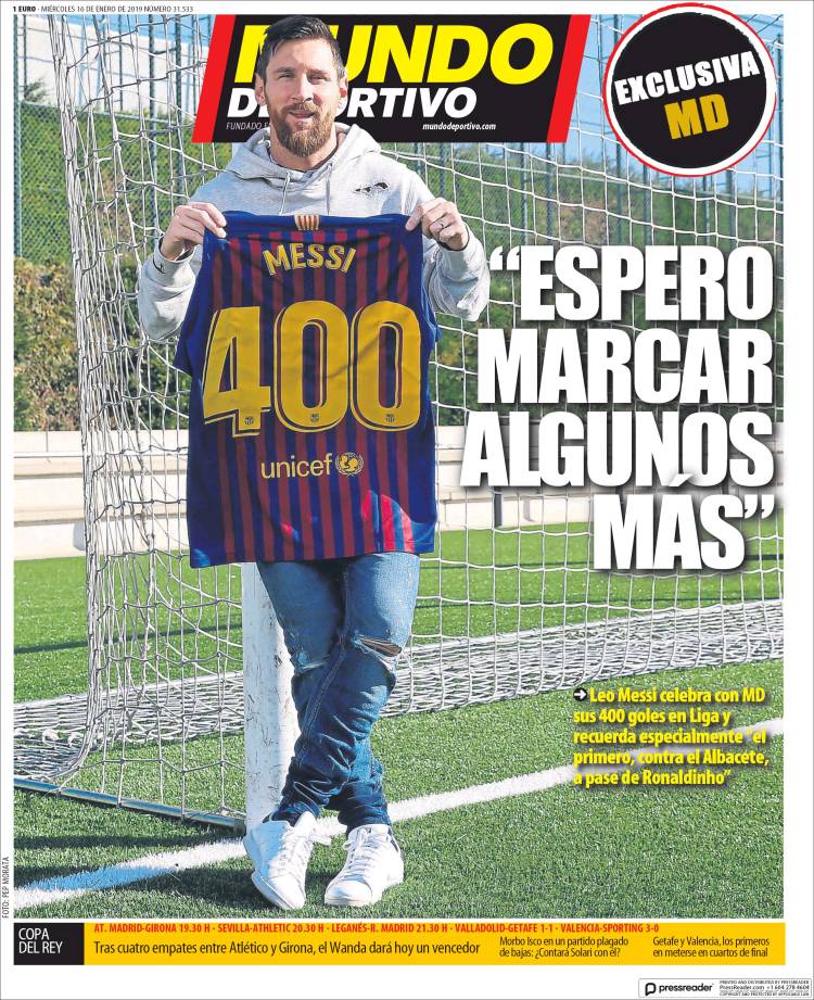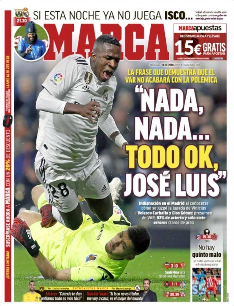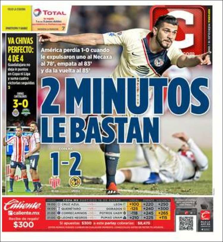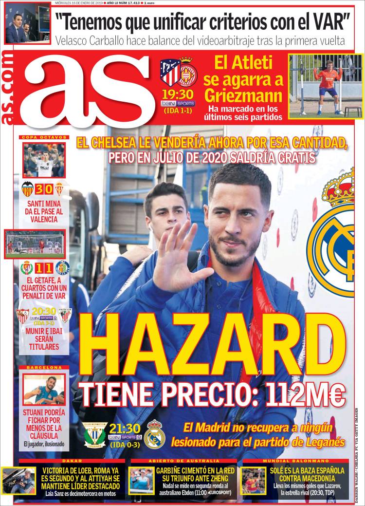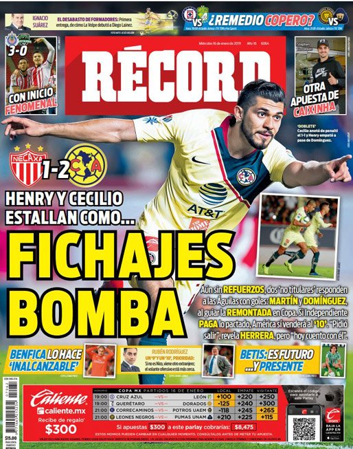 El Real Madrid y el VAR en LaLiga sigue siendo tema de polémica. (Marca) Messi espera anotar más en la la liga española. (Mundo Deportivo) América debutó con triunfo en la Copa MX Clausura 2019. (Cancha) River Plate venció por la mínima diferencia a Nacional de Uruguay. (Olé) A Benfica le bastó un gol para vencer a Guimaraes en los Cuartos de Final de la Copa de Portugal. (Record) Cristiano Ronaldo y Gonzalo Higuaín se verán las caras en la Supercopa de Italia. (Tuttosport) La joya del Benfica, Joao Félix, le dio el triunfo a su equipo en la Copa de Portugal. (A Bola) Sí Real Madrid quiere comprar a Hazard en este mercado de invierno tendrá que pagar 112 millones de euros al Chelsea. (As) La Supercopa de Italia es una «Final Prohibida», así lo titula este diario. (Corriere dello Sport) Jordi Alba (futbolista) y Jessica Vall (nadadora) fueron reconocidos como los mejores deportistas del 2018 en la Festa de l’Esport Català. (Sport) La Copa de Portugal podría tener semifinales explosivas con grandes rivalidades. (O Jogo) Henry Martín y Cecilio Domínguez le dieron el triunfo al America en Copa MX. (Récord)Relacionado