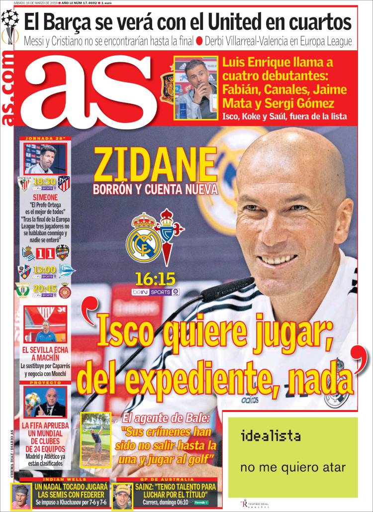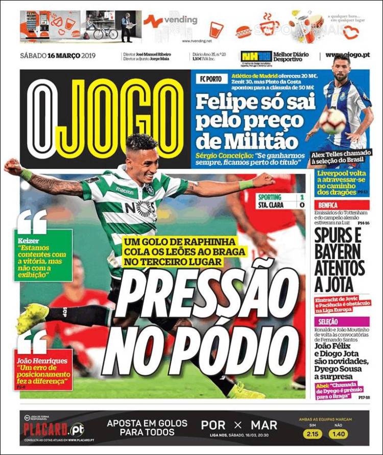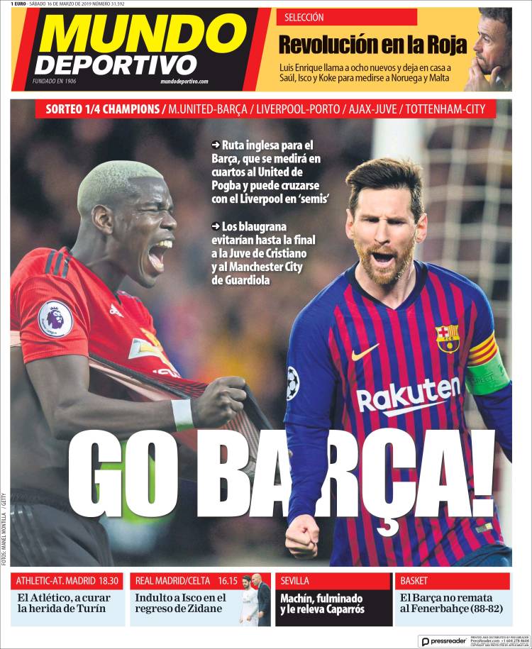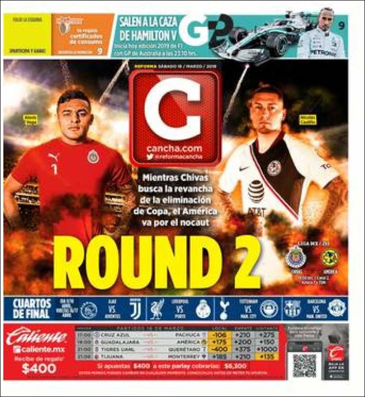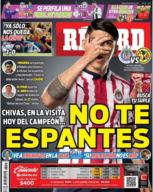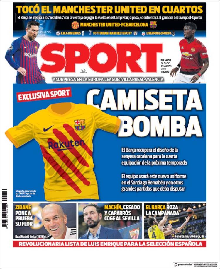 Chivas y América volverán a disputar un ‘Clásico Nacional’ pero ahora en el Estadio Akron. (Cancha) Matthijs de Ligt suena para llegar a la Juventus la próxima temporada. (Tuttosport) Esta será la cuarta equipación con la cual el Barça juegue la próxima temporada. (Sport) El Sporting de Lisboa volvió a la senda del triunfo en la liga de Portugal. (Record) El Racing de Avellaneda buscará vencer a Belgrano para retener el liderato de la clasificación general de la liga de Argentina. (Olé) Raphael Dias Belloli le dio el triunfo al Sporting de Lisboa frente a Santa Clara. (O Jogo) Pumas cayó frente al Puebla en el Estadio Cuauhtémoc. (Esto) El Barcelona enfrentará al Manchester United en los Cuartos de Final de la Champions League. (Mundo Deportivo) Zinedine Zidane tendrá su debut ante el Celta de Vigo en la actual temporada. (Marca) Los pilotos de Francia se alistan para su regreso a la F1 como Pierre Gasly del Red Bull Racing y Romain Grosjean del equipo Haas. (L’Equipe) Se alista el ‘Clásico Nacional’ de la Liga MX. ¿Qué equipo ganará? (Récord) Messi y CR7 podrían enfrentarse en la gran final de la Champions League. (Corriere dello Sport) Zidane señaló en rueda de prensa que Isco quiere jugar en el primer equipo. ¿Lo pondrá en su cuadro titular? (As) El Sporting de Lisboa ganó su compromiso de liga y se mantiene en el tercer sitio de la clasificación general. (A Bola)Relacionado