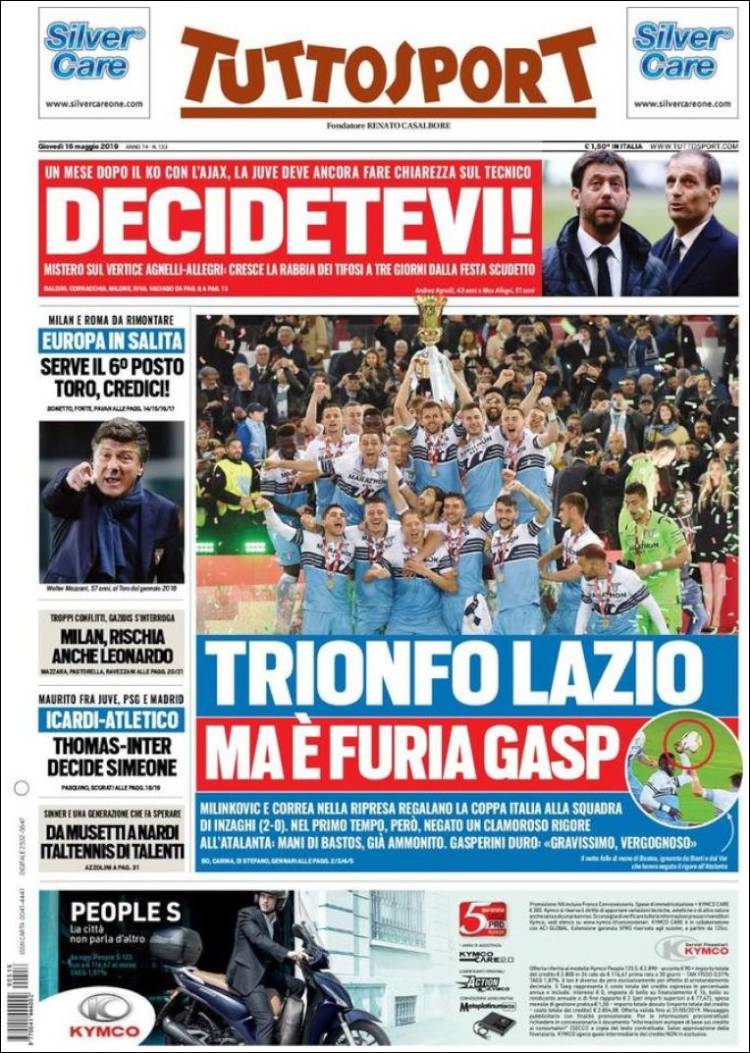 Lazio es nuevo campeón de Copa y esta es la séptima vez que la consiguió en su historia. (Tuttosport)