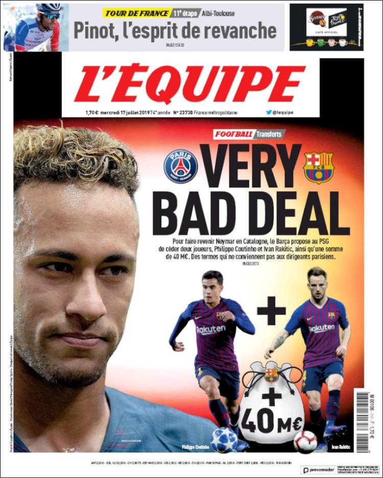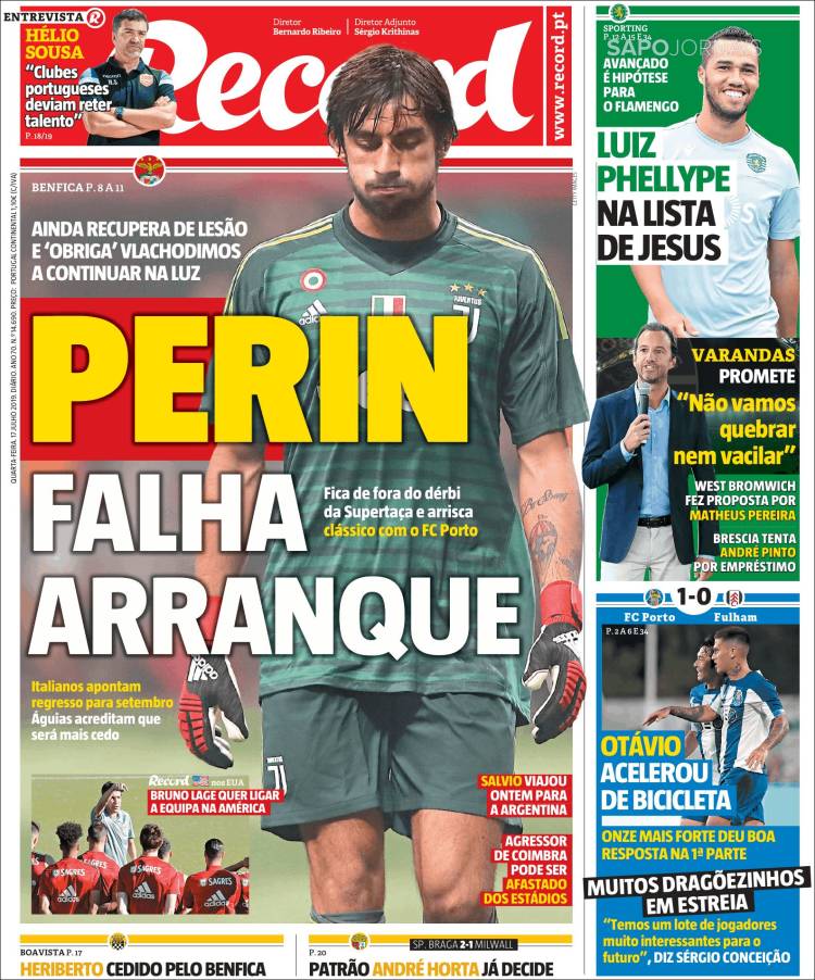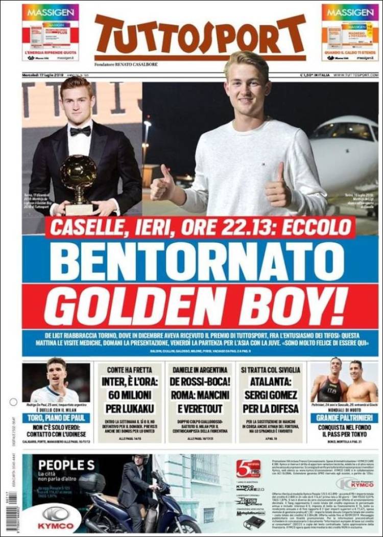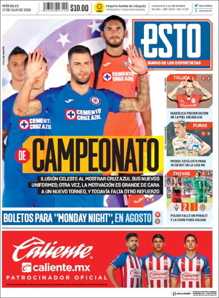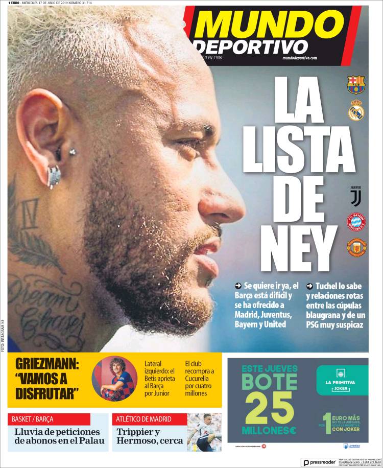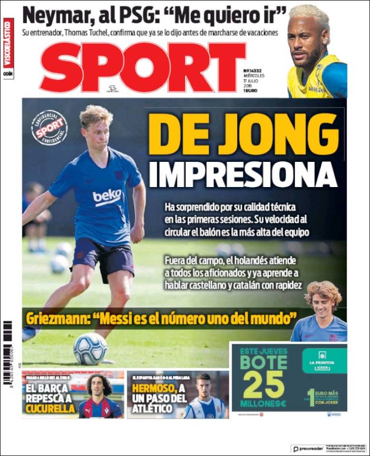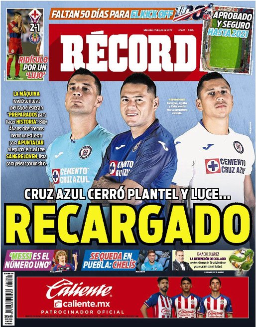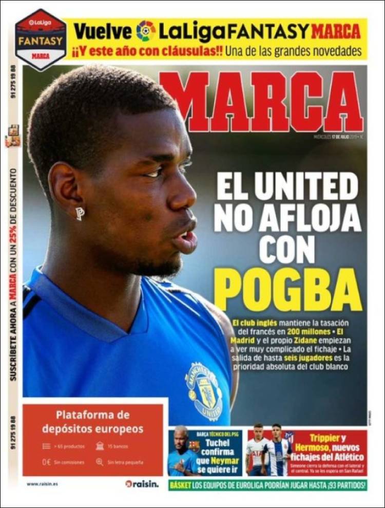 La llegada de Paul Pogba al Real Madrid se complica. (Marca) Gareth Bale, James Rodríguez, Isco, Marco Asensio y Dani Ceballos, serían otras bajas del Real Madrid. (As) Matthijs de Ligt podría ser el nuevo ‘Goldey Boy’ (Tuttosport) La ‘Máquina’ buscará coronarse en el Apertura 2019. (Esto) Cruz Azul presentó su nueva armadura para el Apertura 2019. ( Récord) El PSG rechazó una oferta del Barça. (L’Equipe) Mattia Perin, portero de la Juve, estaría cerca de firmar por el Benfica. (A Bola) Además del Barça hay otros equipos que podrían fichar a Neymar. (Mundo Deportivo) Frenkie de Jong impresionó en sus primeros entrenamientos con el Barcelona. (Sport) Mattia Perin se encuentra lesionado y complicaría su llegada al Benfica. (Record) Porto venció al Fulham en partido de pretemporada, con gol de Otávio. (O Jogo) ‘Bernardo N’ aseguró que mataron su sueño de ser futbolista profesional tras el abuso sexual que sufrió con el equipo de Veracruz. (Cancha) Antonio Conte quiere a Romelu Lukaku como refuerzo para la siguiente temporada. (Corriere dello Sport)Relacionado