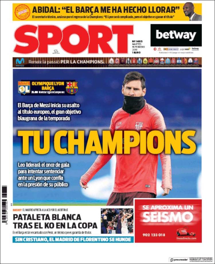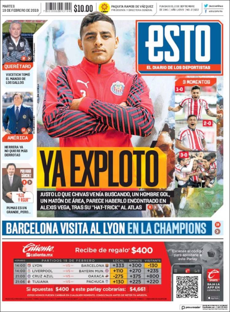 Barcelona y Messi buscarán ganarle a Olympique de Lyon en Francia. (Sport) Giorgio Chiellini dijo que el Atlético de Madrid es más italiano que español. (Marca) Bruno Lage, técnico del Benfica, ha sido pieza fundamental para que el equipo volviera a la lucha por el título. (A Bola) Racing goleó a Godoy Cruz y continúa como líder de la Superliga de Argentina. (Olé) Leonardo Bonucci dijo que alucina trabajar con Cristiano Ronaldo. (As) Olympique de Lyon buscará la victoria en casa cuando enfrente al Barcelona. (L’Equipe) Mauro Icardi suena como opción para la Juve. (Corriere dello Sport) Seferovic, Silva y Ferro le dieron la victoria al Benfica. (O Jogo) Alexis Vega despertó en la Liga MX con la platera rojiblanca y buscará ser el hombre gol de Chivas. (Esto) Ricardo Peláez, director deportivo de Cruz Azul, propuso un nuevo formato para la Copa MX y pidió más interés a este torneo. (Cancha) Alexis Vega se reencontró con el gol en el ‘Clásico Tapatío’ y buscará más anotaciones con la elástica de Chivas. (Récord) Benfica venció de visita a Desportivo Aves y se mantine como sublíder de la liga portuguesa. (Record) Barcelona intentará vencer de visita al Olympique de Lyon en el juego de ida de los Octavos de Final de la Champions. (Mundo Deportivo) Mauro Icardi podría interesarle a la Juventus y reencontrase con Paulo Dybala. (Tuttosport) Víctor Manuel Vucetich se convirtió en el nuevo técnico de Querétaro. (Adrenalina)Relacionado
