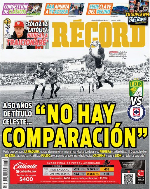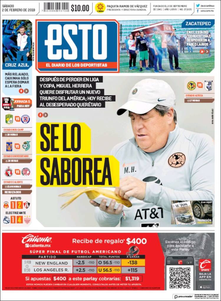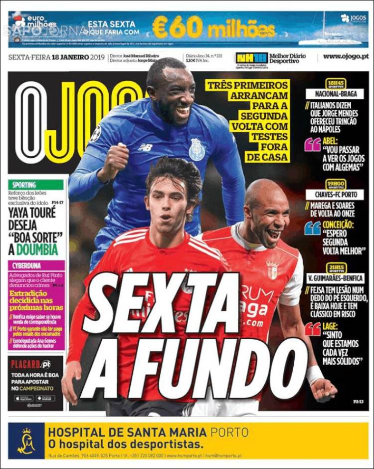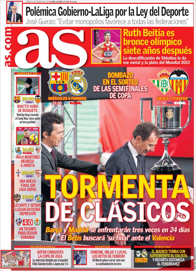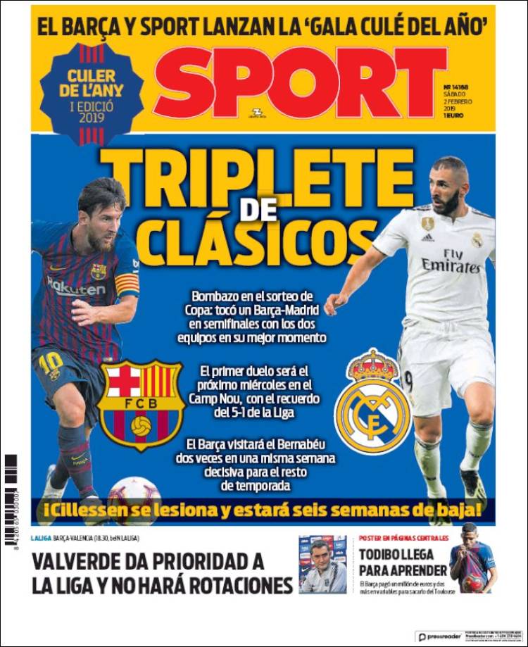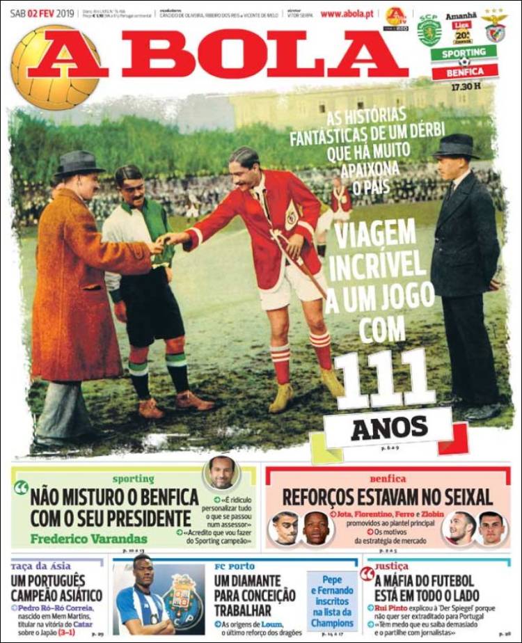 El ‘Derby de la Capital’ entre el Benfica y Sporting de Lisboa, cumple 111 años de existencia. (A Bola) El Barcelona y Real Madrid tendrán que enfrentarse tres veces en menos de un mes. (Mundo Deportivo) El bombazo de las Semifinales de la Copa del Rey será el enfrentamiento entre el Barcelona y Real Madrid. (Marca) Se cumplen 50 años del primer título de Cruz Azul. (Récord) El Clásico español se disputará en las Semifinales de Copa. (As) Mario Mandžukić podría regresar a la titularidad con la Juventus. (Tuttosport) El Barcelona y Real Madrid se enfrentarán tres veces en menos de un mes. (Sport) Frederico Varandas, directivo del Sporting de Lisboa, empezó a calentar el enfrentamiento ante el Benfica. (Record) Defensa y Justicia no deja de pelear por el liderato de la Superliga de Argentina, luego de vencer a San Martín de Tucamán. (Olé) Equipos como el Porto, Sporting Braga y Benfica buscarán ganar en sus respectivos partidos con el objetivo de ser el mejor de Portugal. (O Jogo) Miguel ‘Piojo’ Herrera quiere volver a la senda del triunfo, luego de perder el invicto en Copa y Liga MX. (Esto) Con una derrota de los New England Patriots ante los Angeles Rams, Tom Brady podría convertirse en el mariscal con más tazones perdidos. (Cancha)Relacionado