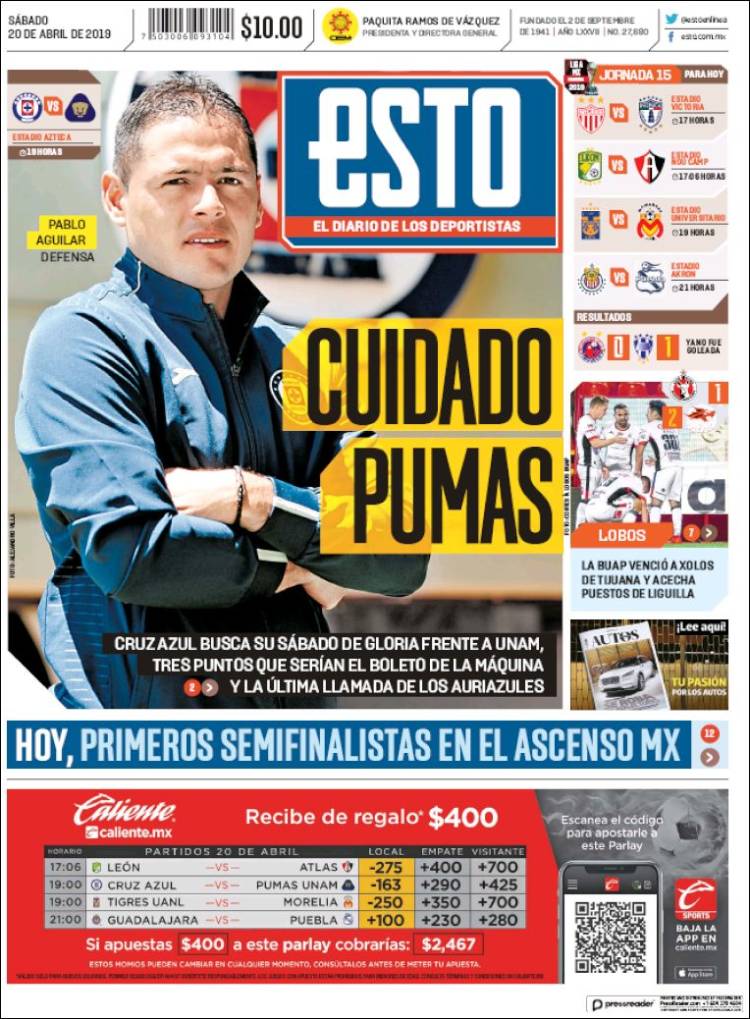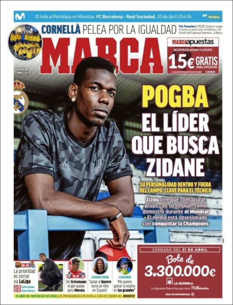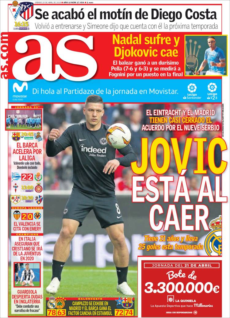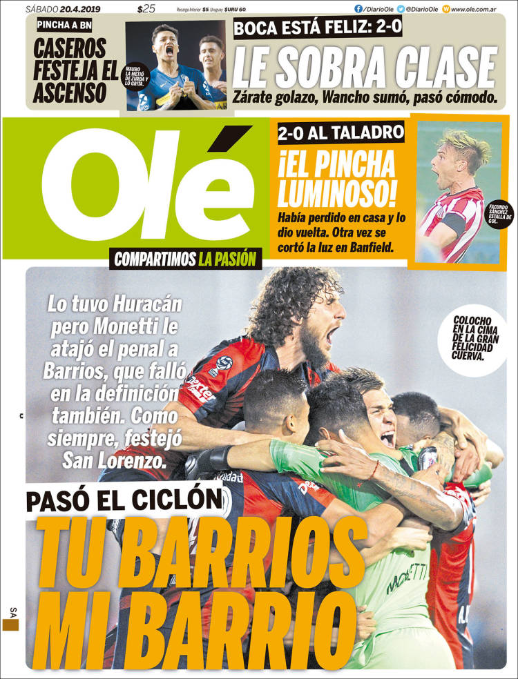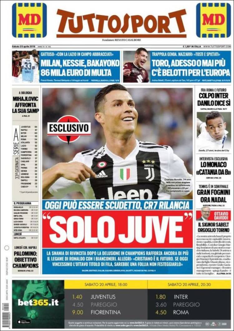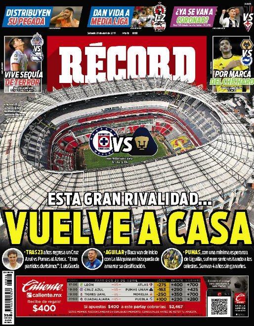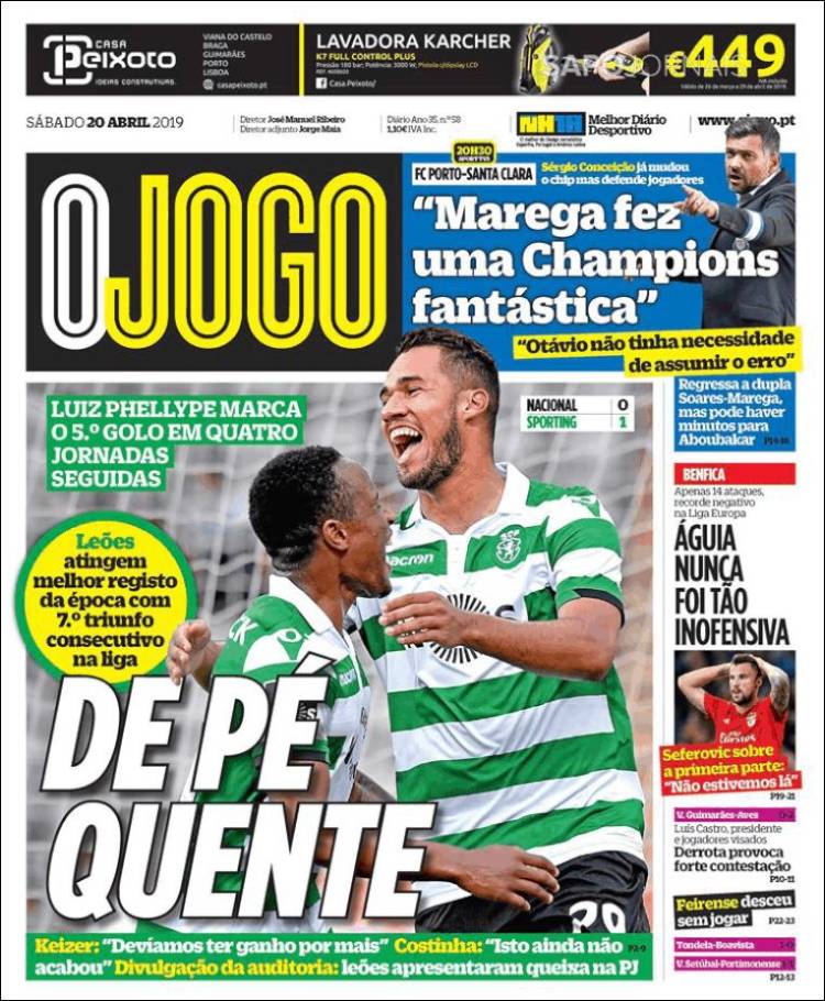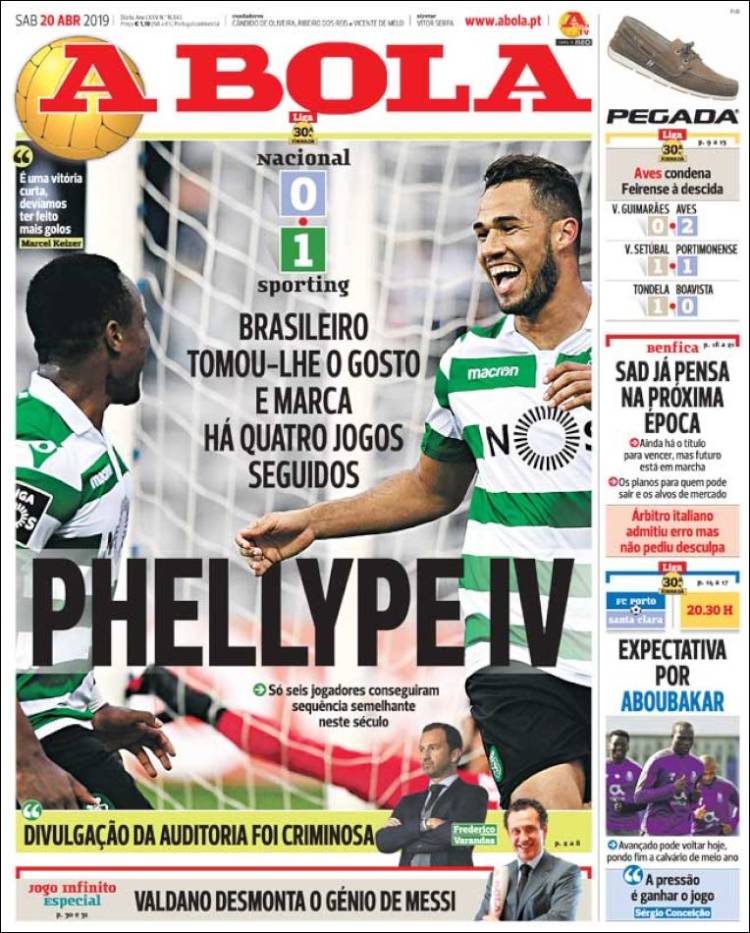 La Juve junto a Cristiano Ronaldo buscarán coronarse en la liga italiana. (Tuttosport) El Barcelona buscará darle muchas alegrías a su afición, ganando títulos. (Sport) El Sporting de Lisboa se mantiene en la tercera posición de la liga de Portugal, luego de vencer a Nacional por la mínima. (Record) San Lorenzo venció a Huracán en tanda de penaltis, en la primera ronda de la Copa de la Superliga Argentina. (Olé) El Sporting de Lisboa logró una victoria importante en la liga de Portugal, gracias a la única anotación de Luiz Phellype. (O Jogo) El Barça se alista para conseguir el título de liga. (Mundo Deportivo) Paul Pogba es una prioridad para el Real Madrid. (Marca) Olympique de Lyon venció de local a Angers. (L’Equipe) Pablo Aguilar se alista para enfrentar a Pumas. (Esto) Cruz Azul y Pumas se preparan para enfrentarse en el Azteca. (Récord) Pumas sufre en todo su organigrama: directivos, cuerpo técnico y jugadores. (Cancha) Luka Jović podría llegar al Real Madrid. (As) El Sporting de Lisboa venció de visita a Nacional. (A Bola)Relacionado