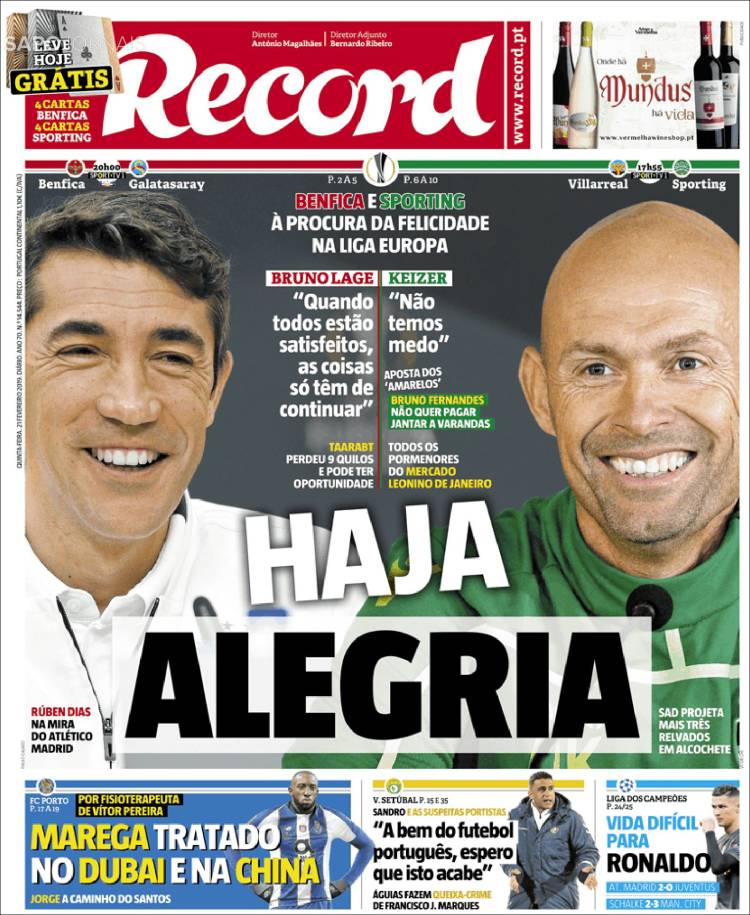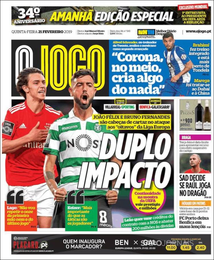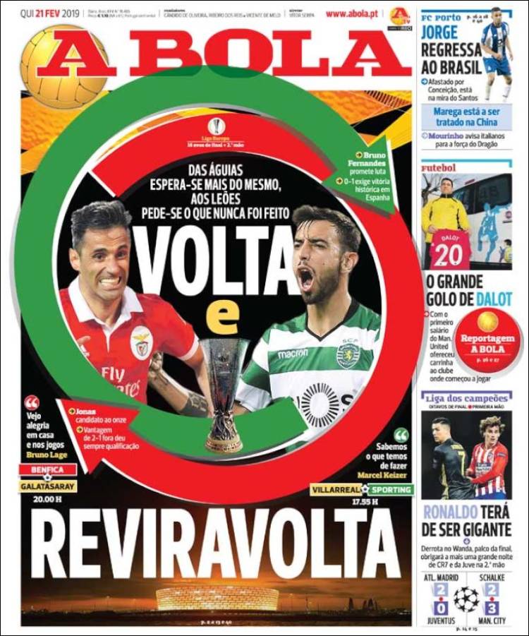 El Benfica buscará ganar de nuevo y Sporting de Lisboa tratará de revertir el marcador global, esto en sus respectivos compromisos en la Europa League. (A Bola)