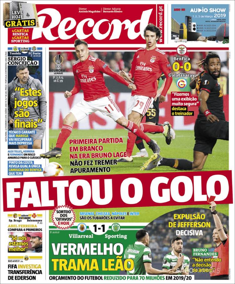 El Benfica avanzó a los Octavos de Final de la Europa League, mientras que el Sporting de Lisboa fue eliminado por el Villarreal. (A Bola)