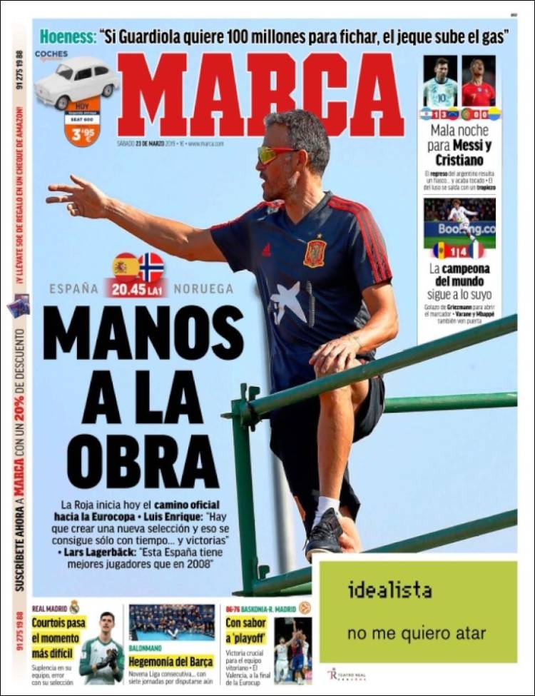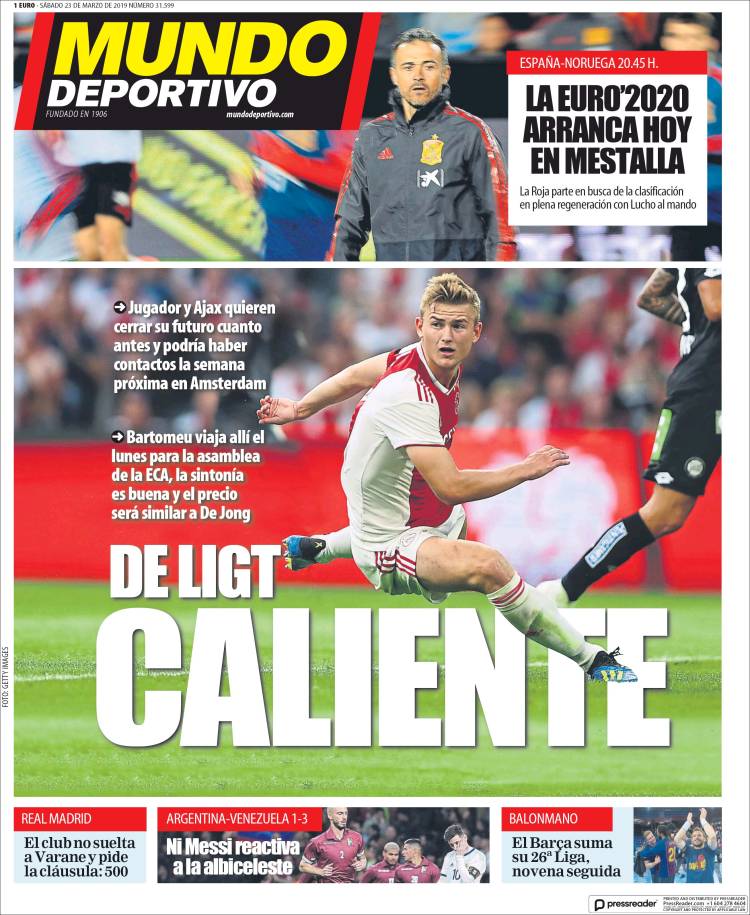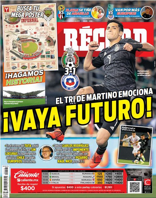 Cristiano Ronaldo tuvo una gris participación con la Selección de Argentina. (O Jogo) Luís Filipe Ferreira Vieira, presidente del Benfica, aseguró que Joao Félix tiene un precio de 120 millones de euros. (Tuttosport) El ‘Tri’ inició con el pie derecho en su regreso a las canchas, comandada por Gerardo Martino. (Cancha) Jiménez, Moreno y Lozano le dieron la victoria a México tras enfrentarse a Chile, en un juego amistoso. (Esto) Los Diablos Rojos del México inaugurarán su nuevo estadio Alfredo Harp Helú, recinto donde enfrentarán a los Padres de San Diego. (Récord) ‘Tata’ Martino tuvo un gran debut con la Selección Mexicana. (Récord) Antoine Griezmann junto a la Selección de Francia lograron vencer a Moldavia de visita, partido clasificatorio para la Euro 2020. (L’Equipe) Con el Wanda Metropolitano casi vacío, Argentina fue víctima del gran juego de Venezuela. (Olé) En el Estadio da Luz, Portugal no logró obtener la victoria. (Record) Con CR7 en el campo, la Selección de Portugal no logró vencer a Ucrania, en su debut en los partidos clasificatorios rumbo a la Euro 2020. (A Bola) La Selección de Italia debutará en los partidos clasificatorios para la Euro 2020, comandada por el estratega, Roberto Mancini. (Corriere dello Sport) Leo Messi regresó a jugar con la Selección de Argentina y al final del partido sufrió una lesión. (Sport) Josep Maria Bartomeu, presidente del Barça podría fichar en los próximos días a Matthijs de Ligt, para la siguiente temporada. (Mundo Deportivo) La ‘Roja’ iniciará un nuevo camino rumbo a la Euro 2020. (As) La Selección de España enfrentará a Noruega en el Estadio de Mestalla, partido clasificatorio para la Euro 2020. (Marca)Relacionado