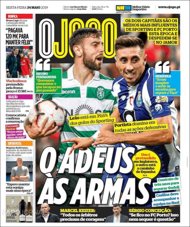 Bruno Fernandes (Sporting de Lisboa) y Héctor Herrera (Porto) se despedirán de sus respectivos equipos, luego de que disputen su último juego en Portugal en la Final de Copa. (O Jogo)