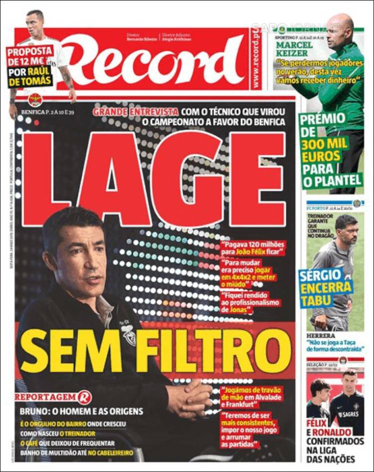 Bruno Lage, estratega del Benfica, tuvo una entrevista especial con este diario, en la que contó un poco de su vida personal. (Record)