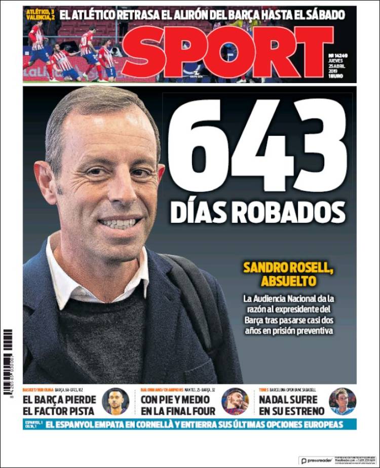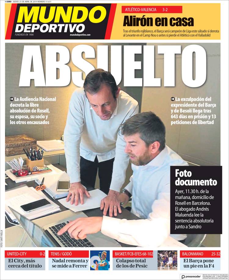 La Audiencia Nacional de España absuelve a Sandro Rosell tras 21 meses de prisión. (Mundo Deportivo)
