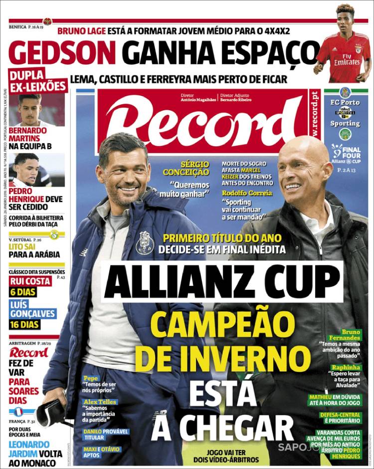 El América quiere mantener su invicto visitando a Monterrey (Récord) Cruz Azul, América y Pumas, quieren dejar huella en la cuarta fecha del Clausura 2019. (Esto) En el segundo día de la cuarta jornada de la Liga MX, los tres equipos capitalinos tendrán acción. (Cancha) Sérgio Conceição, estratega del Porto, y Marcel Keizer, del Sporting, serán protagonistas en la final de Copa. (Record) El líder de la liga portuguesa (Porto) luchará para ser campeón en Copa. (O Jogo) El Porto y Sporting de Lisboa lucharán este día por el título de la Copa de la Liga portuguesa. (A Bola) Martín Cáceres regresó como elemento de la Juventus, luego de ser cedido al Hellas Verona. (Tuttosport) Krzysztof Piątek y Arkadiusz Milik son delanteros polacos que se verán las caras en el juego de Milán vs Napoli. (Corriere dello Sport) Vinicius Jr. se ha convertido en pieza clave del cuadro blanco. (Marca) Antonio Pintus, preparador físico del Real Madrid, le ha cambiado la cara al equipo con su pretemporada invernal. (As) Frenkie de Jong agradeció al Barcelona por haberlo fichado. (Sport) El Barcelona no descarta fichar a Matthijs de Ligt, actual elemento del Ajax. (Mundo Deportivo) Defensa y Justicia del futbol argentino venció a San Lorenzo y con esta victoria se colocó como sublíder de la Superliga. (Olé)Relacionado