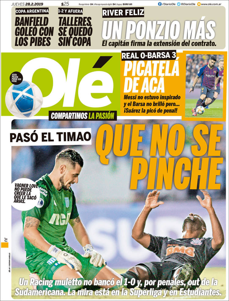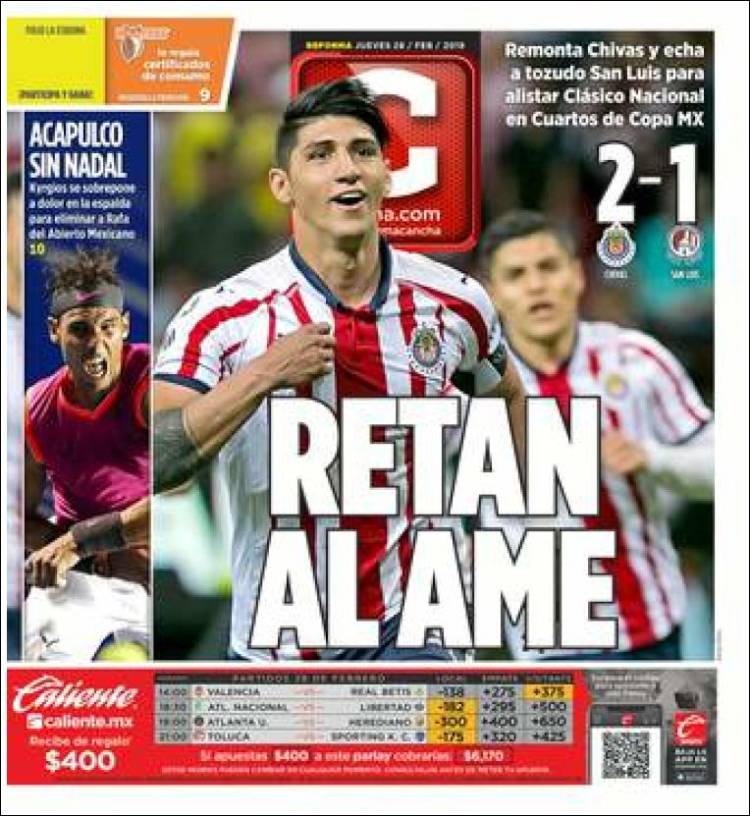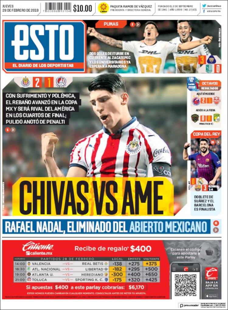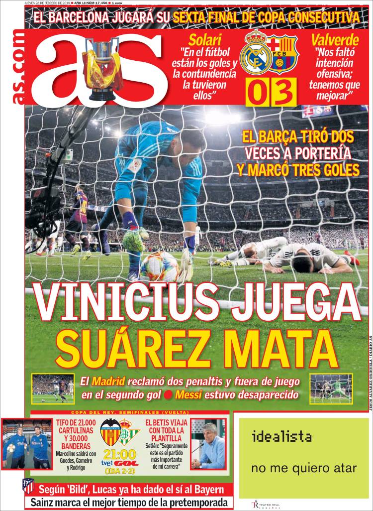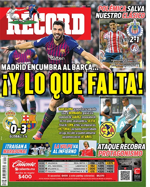 El Barcelona se instaló en la Final de la Copa del Rey y espera rival. (Récord) El Barça fue más contundente frente al marco rival, algo de lo que sufrió mucho el cuadro blanco en el Bernabéu. (Sport) Racing de Avellaneda fue eliminado en la primera ronda de la Copa Sudamericana tras caer en penales frente al Corinthians. (Olé) Cristiano Ronaldo sufrió de un golpe en el tobillo ante Bolonia y su presencia en el siguiente partido de liga aún está en duda. (Tuttosport) Luis Suárez comando la victoria del Barça en el Bernabéu. (Mundo Deportivo) El Real Madrid volvió a perder frente al Barça en el Santiago Bernabéu. (As) Moussa Marega, delantero de Porto, se recupera de una lesión complicada. (O Jogo) Olympique de Lyon venció de local al Caen, partido correspondiente a los Cuartos de Final de la Copa de Francia. (L’Equipe) Cristian Romero, el joven de 20 años que le interesa a la Juventus. (Corriere dello Sport) Vinicius Jr. falló frente a la portería y Luis Suárez fue más efectivo en el marco rival. (Marca) Por la crisis económica que vive el Sporting de Lisboa podría quedar sin dinero en abril. (A Bola) Sporting de Lisboa se encuentra en crisis financiera. (Record) Chivas logró su boleto a Cuartos de Copa y su próximo rival será el América. (Cancha) Chivas venció al Atlético San Luis y avanzó a Cuartos de Final de Copa MX. (Esto)Relacionado