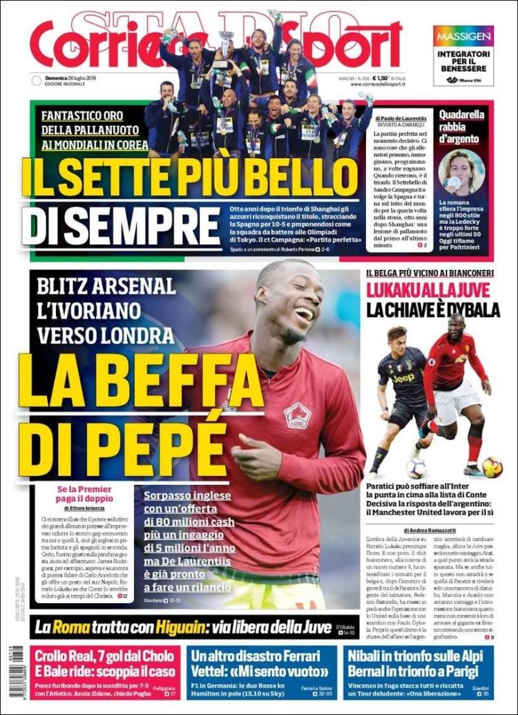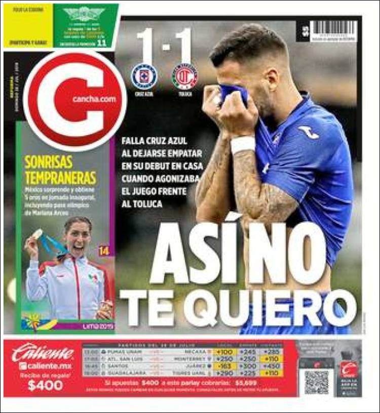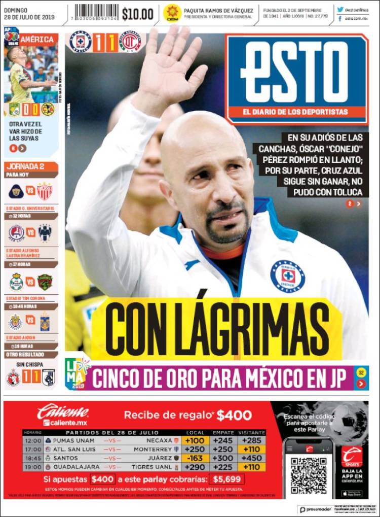 ¡Buenos días, Nación! Mucho que hablar en el mundo deportivo sobre lo sucedido el sábado, las portadas de los diarios deportivos del 28 de julio 2019 en México lo que más destacó fue el Cruz Azul, lamentablemente otra vez los últimos minutos trajeron un resultado fatídico para los dirigidos por Pedro Caixinha y por si fuera poco se va un grande, Óscar el ‘Conejo’ Pérez cuelga los guantes luego de 26 años de carrera; en el país de la bota hablan sobre una posible salida de Dybala con destino a Manchester, mientras que Lukaku podría arribar en su lugar.