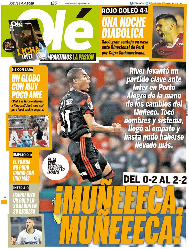River Plate empató de visita frente al Internacional de Porto Alegre, en la Copa Libertadores. (Olé)