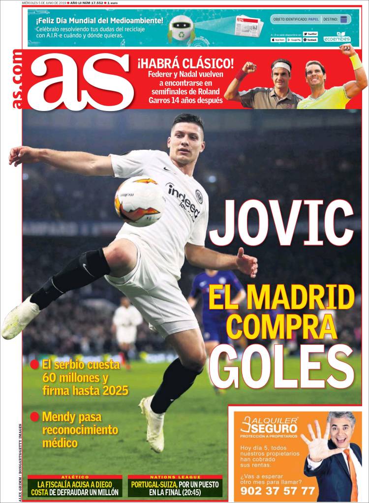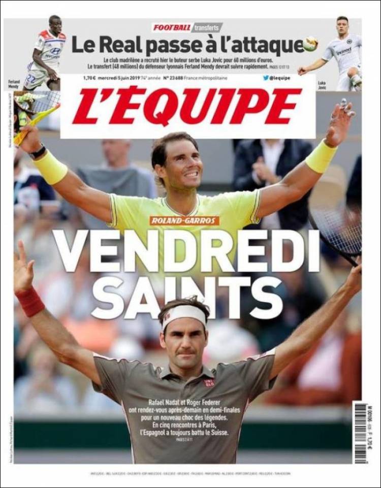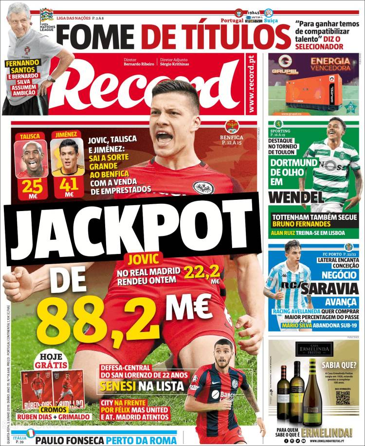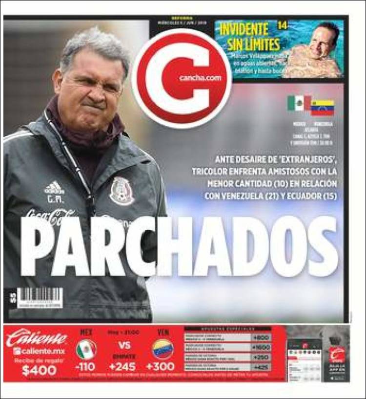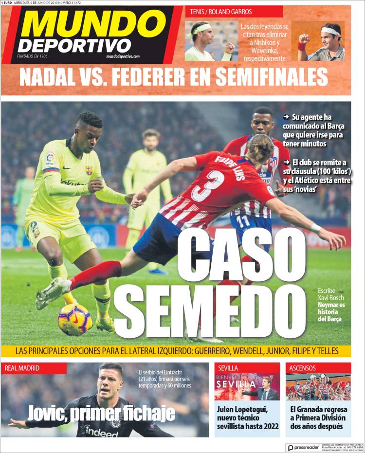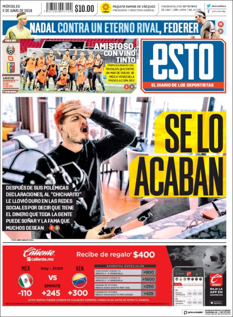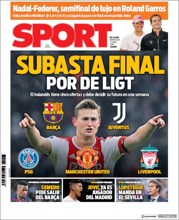 ‘Chicharito’ fue muy criticado por exjugadores del futbol mexicano. (Esto) Matthijs de Ligt aún no sabe con que club fichar. De tras de él está el Barça, PSG, Liverpool, Juventus y Manchester United. (Sport) Rafael Nadal y Roger Federer se enfrentarán en las semifinales del Torneo Roland Garros. (L’Equipe) Maurizio Sarri quiere volver al futbol italiano y continúa siendo el favorito para llegar al banquillo de la Juventus. (Tuttosport) La Selección de Portugal buscará llegar a la Final de la Liga de Naciones 2019. (A Bola) Maxi Meza podría regresar a Boca Jrs tras su poca participación con los Rayados. (Olé) Nélson Semedo, podría salir del Barcelona pero su costo es muy elevado sin haber tenido mucha participación con el club. (Mundo Deportivo) El Benfica ha salido muy beneficiado de los jugadores que salen del club a préstamo y después son comprados. (Record) La Selección de Portugal junto a CR7 se alista para enfrentar a Suiza en la semifinal de la Liga de Naciones de Europa. (O Jogo) Luka Jovic llegó al Real Madrid procedente del Eintracht Frankfurt. (As) Luka Jovic se convirtió en el segundo refuerzo oficial del Real Madrid. (Marca) ‘Tata’ Martino buscará un triunfo sobre Venezuela. (Cancha)Relacionado