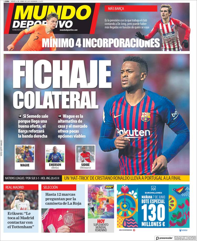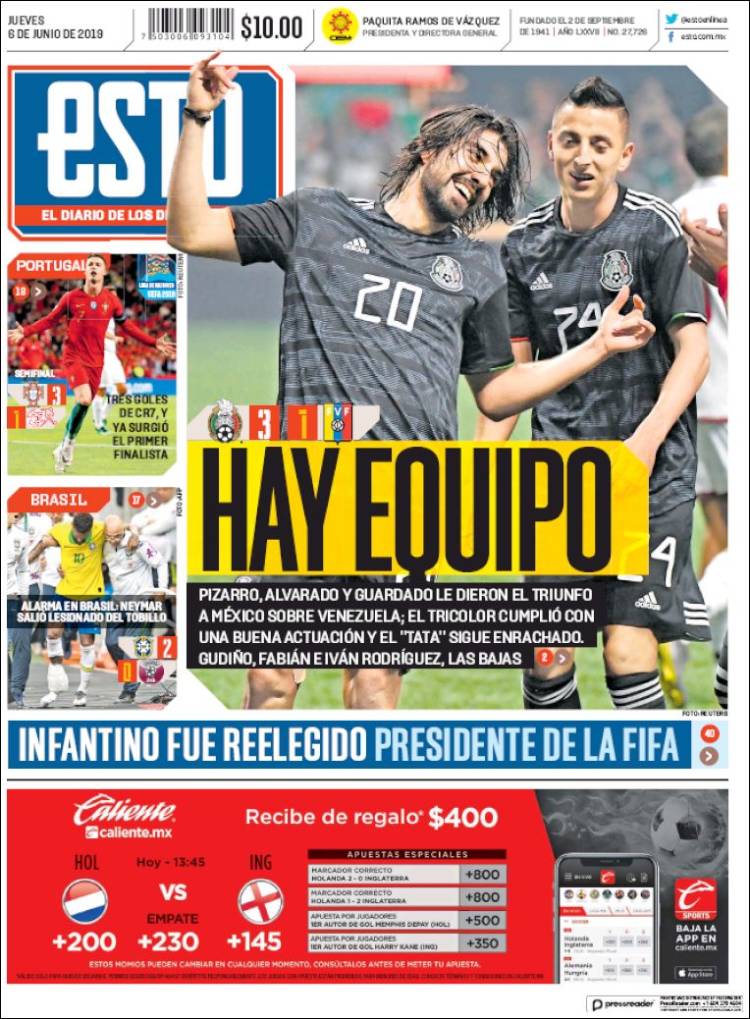 México venció a Venezuela en su primer amistoso de cara a la Copa Oro 2019. (Esto) Neymar solo quiere fichar con el Barça. (Sport) Varias figuras de la Liga de Francia han salido y otras están por salir. ( Andrea Pirlo formaría parte del cuerpo técnico de Maurizio Sarri, siempre y cuando llegue al banquillo de la Juventus. ( CR7 le dio la victoria y el pase a la Final a la Selección de Portugal. (A Bola) CR7 se lució en las semifinales de la Nations League con un hat-trick. (Record) Eden Hazard sería el tercer refuerzo que el Real Madrid anunciaría en las próximas horas. (As) En 5 años como D.T. de River Plate, Marcelo Gallardo ha ganado varios títulos. (Olé) CR7 volvió a anotar con la Selección de Portugal. (O Jogo) A Christian Eriksen le gustaría llegar al Real Madrid. (Marca) Nélson Semedo saldría del Barça y en el club ya tiene 3 opciones para sustituirlo. (Mundo Deportivo) Alvarado, Pizarro y Guardado le dieron el triunfo a México. (Cancha)Relacionado