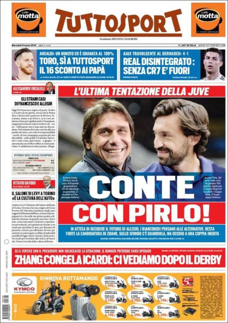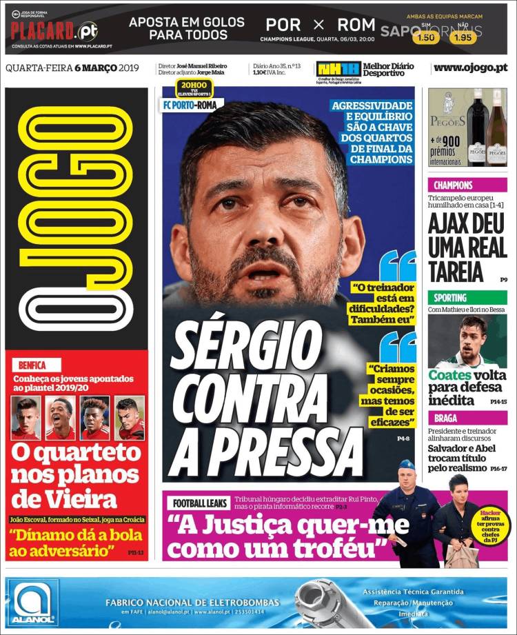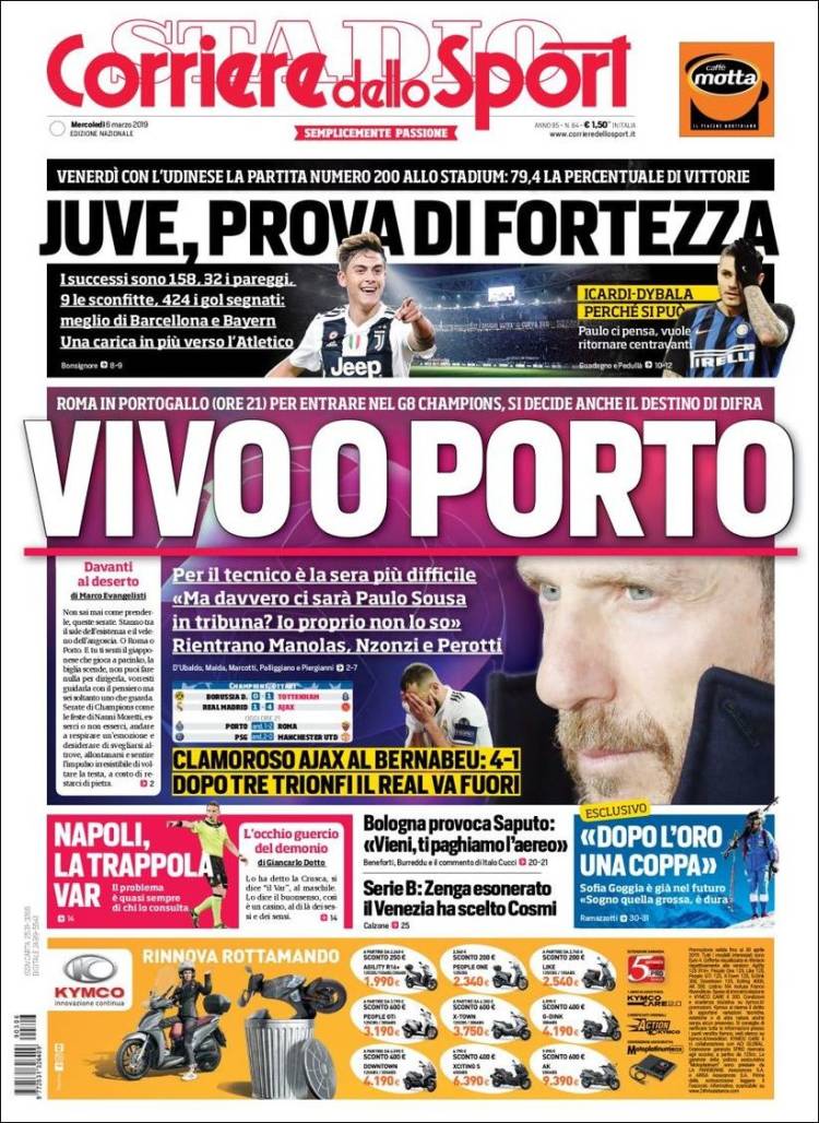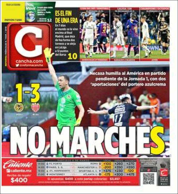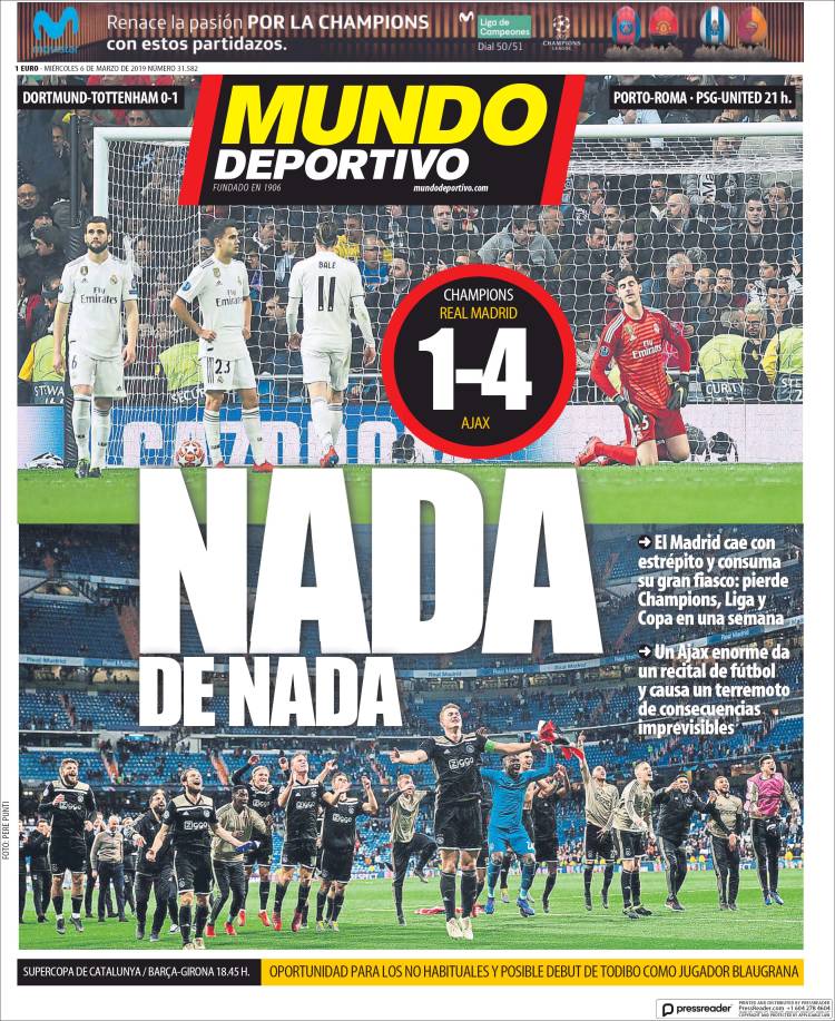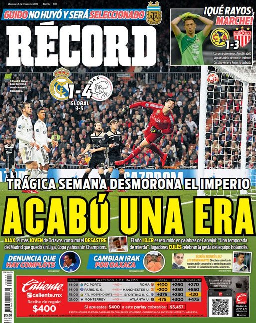 El Porto definirá su futuro en Champions frente a la Roma. (A Bola) El Real Madrid se quedó sin Champions League, Copa del Rey y Liga. (As) Eusebio Di Francesco y compañía buscarán la victoria en Estadio do Dragão para continuar vivos en Champions. (Corriere dello Sport) El Real Madrid ha hecho historia en el Bernabéu, pero esta ocasión se quedó fuera de la Champions. (Marca) El Real Madrid fracasó en la Champions y el Ajax se convirtió en la sorpresa del torneo. (Mundo Deportivo) El América perdió la oportunidad de escalar posiciones en la Liga MX luego de caer frente al Necaxa en el Azteca. (Cancha) El América quedó fuera de los sitios de Liguilla y Necaxa se colocó como quinto tras ganarle a las ‘Águilas’. (Esto) Sérgio Conceição quiere que su plantilla este tranquila para vencer a la Roma. (O Jogo) Boca Jrs. empató en su debut en la nueva edición de Copa Libertadores frente al Wilstermann de Bolivia. (Olé) Jonas, jugador del Benfica, se ha convertido en una figura para el equipo. (Record) Se terminó la era más gloriosa del Real Madrid luego de ser eliminado de Champions. (Sport) El futuro de Massimiliano Allegri con la Juventus no es seguro, por lo que empiezan a sonar más nombres para sustituirlo. (Tuttosport) El Real Madrid fue eliminado de Champions y América perdió ante Necaxa. (Récord)Relacionado