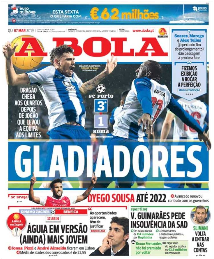 El Porto venció a la Roma en el juego de vuelta de los Octavos de Final de la Champions League. (A Bola)