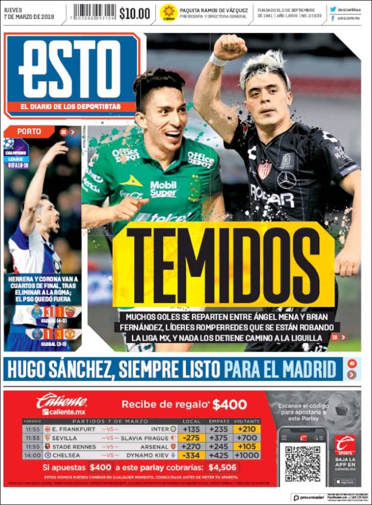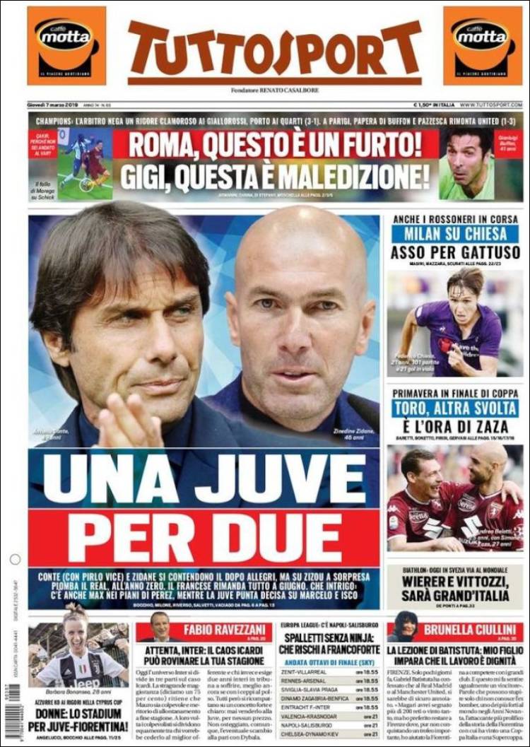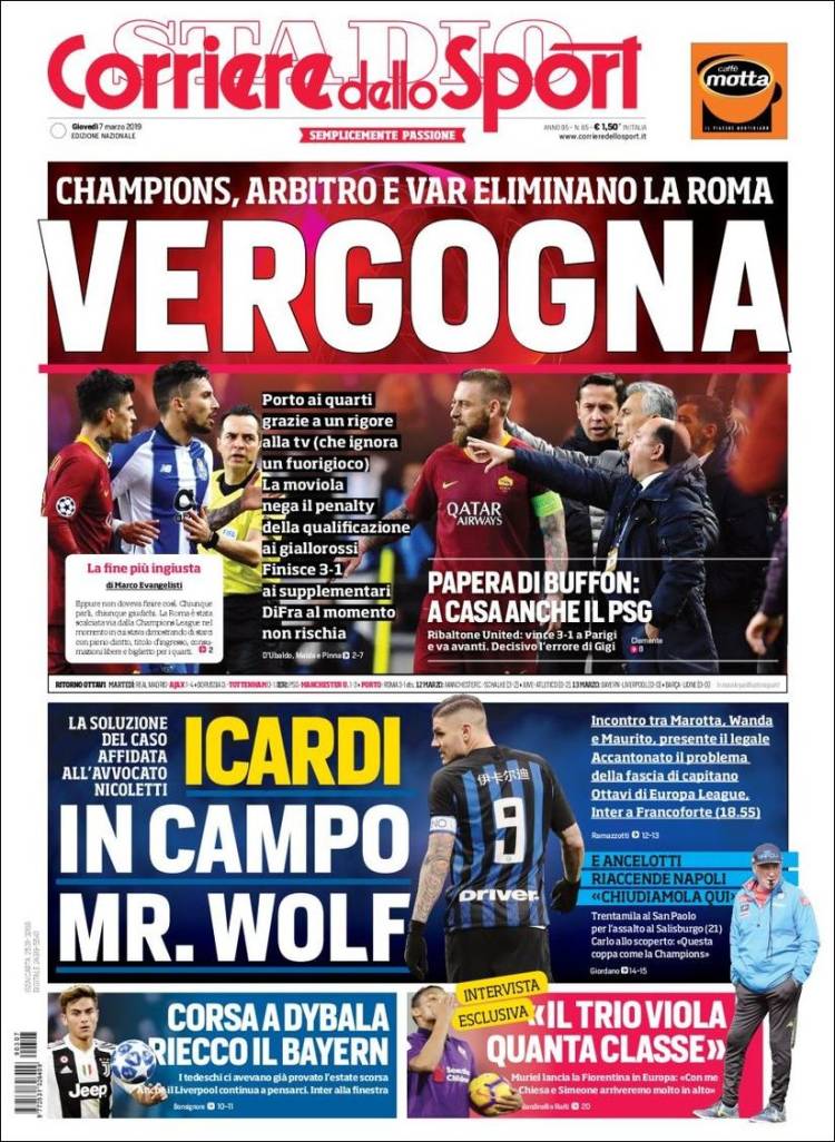 La Roma fue eliminada de la Champions League y por su parte el Inter de Milán buscará tomar ventaja en su compromiso de Europa League. (Corriere dello Sport)