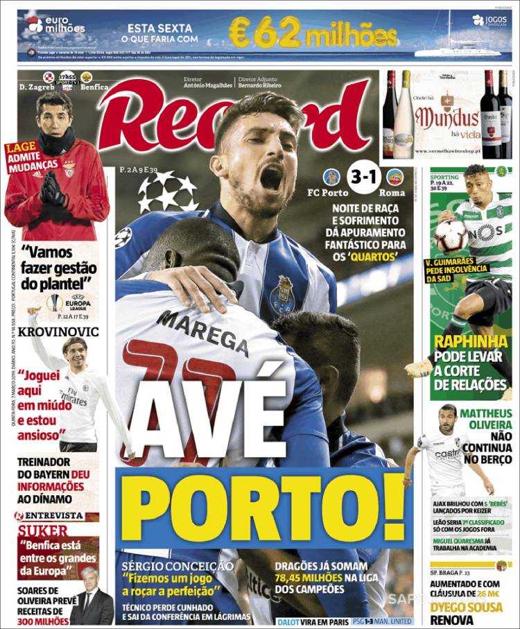 El Porto venció a la Roma en el juego de vuelta de los Octavos de Final de la Champions League. (A Bola)