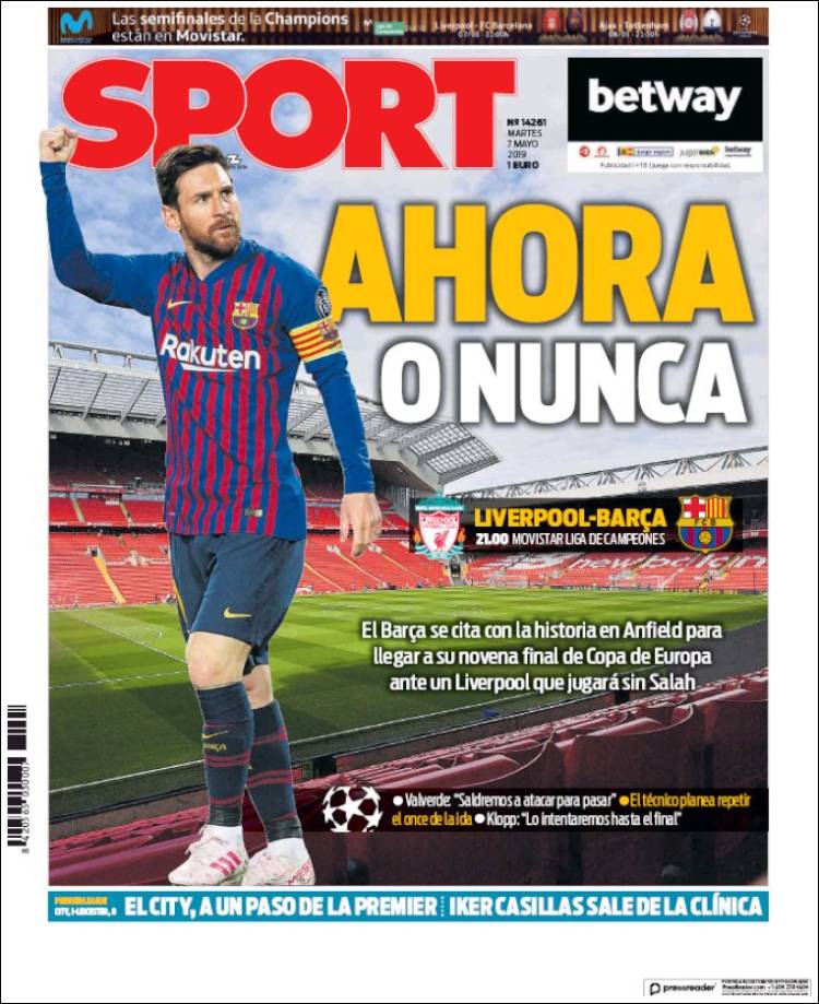 Alberto Moreno, lateral izquierdo del Liverpool, podría ser fichado por el Benfica. (A Bola) Las negociaciones del Real Madrid por Eden Hazard empezaron a complicarse. (As) Andrea Agnelli, intentará proponer algunas iniciativas para mejorar el futbol europeo. (Tuttosport) El Barça no dejará ir la oportunidad de ganar en Anfield para regresar a una Final de Champions League. (Sport) Los jugadores del Sporting de Lisboa quieren ofrecerle la Bota de Oro a su capitán, Bruno Fernandes. (Record) La afición del River Plate ha empezado a recolectar bronce para la estatua de Marcelo Gallardo. (Olé) Iker Casillas salió del hospital tras el problema cardíaco que sufrió la semana pasada. (O Jogo) El Barcelona quiere finiquitar la serie de Semifinales en Anfield. (Mundo Deportivo) Gareth Bale, Dani Ceballos y Marcos Llorente son los jugadores que podrían salir del Real Madrid. (Marca) En Anfield, Messi buscará sellar el pase a la Final para el Barça. (L’Equipe) Pedro Caixinha buscará eliminar al América de Liguilla. (Esto) Jesús Ramírez fue nombrado nuevo Presidente Deportivo de Pumas. (Cancha) Pedro Caixinha ya no le teme al América. (Récord) Todo listo para que arranque la Liguilla del Clausura 2019. (Récord)Relacionado