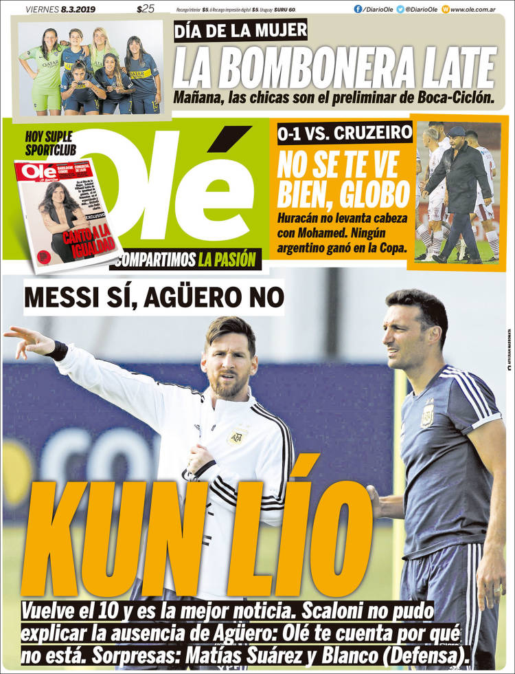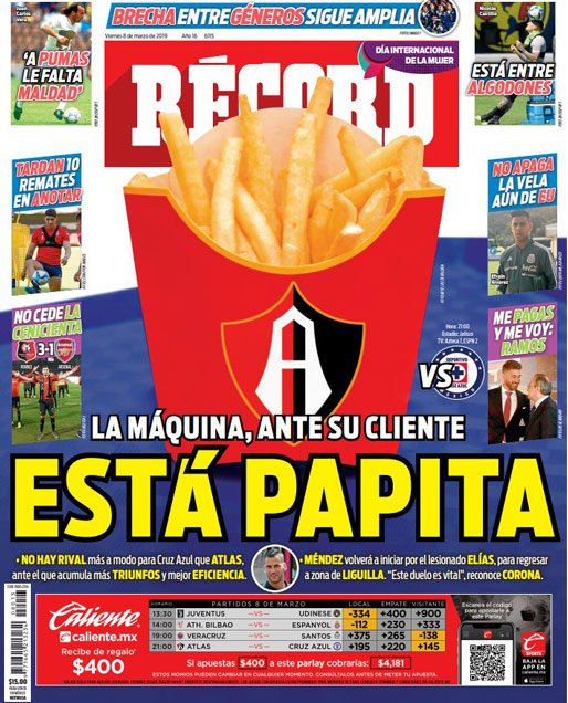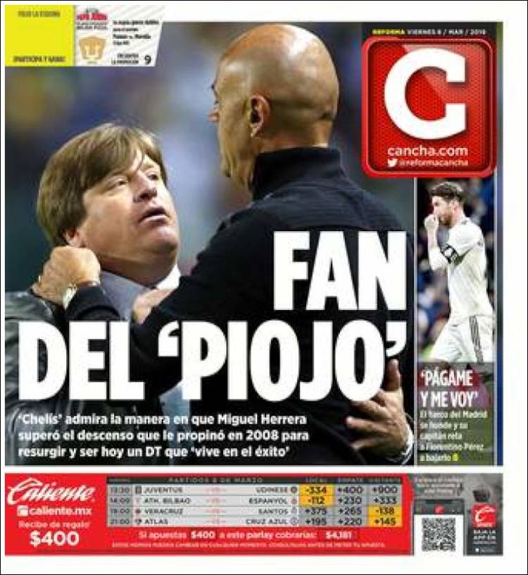 La Juventus podría fichar a nuevos elementos de gran nivel para la siguiente temporada. (Tuttosport) En conmemoración al Día Internacional de la Mujer, este diario reconoció a las deportistas del Barça. (Sport) Haris Seferović, delantero del Benfica, terminó lesionado en la Europa League. (Record) Lionel Scaloni dio a conocer la convocatoria de la Selección de Argentina y considero a Messi para la Fecha FIFA de marzo. (Olé) Detienen el invicto del Benfica en la Europa League. (O Jogo) Robert Siboldi se enfrentará a su ex equipo, con el cual se coronó por primera vez en México. (Esto) José Luis Sánchez Solá admira la carrera de Miguel ‘Piojo’ Herrera. (Cancha) Sergio Ramos amenazó a Florentino de irse de la institución. (Mundo Deportivo) El Real Madrid sufre fuera y dentro de la cancha, ahora el capitán del equipo, Sergio Ramos se encaró con el presidente del club. (Marca) Claudio Ranieri podría convertirse en nuevo estratega de la Roma. (Corriere dello Sport) La Selección Femenil de España estrenará nueva indumentaria para el Mundial de Francia. (As) El Benfica cayó en el juego de ida de los Octavos de Final de la Europa League ante el Dinamo de Zagreb Cruz Azul enfrentará al Atlas en el Estadio Jalisco. (Récord)Relacionado