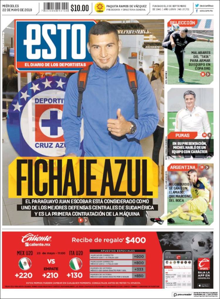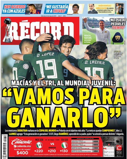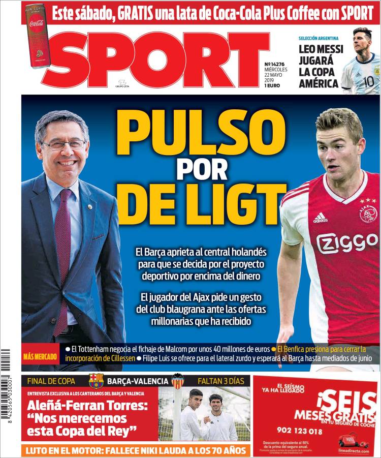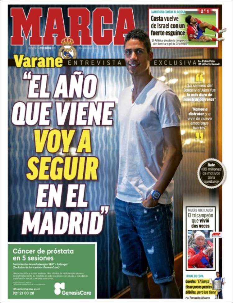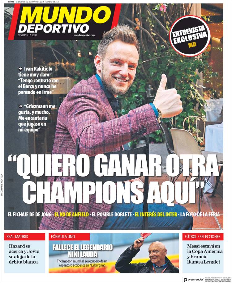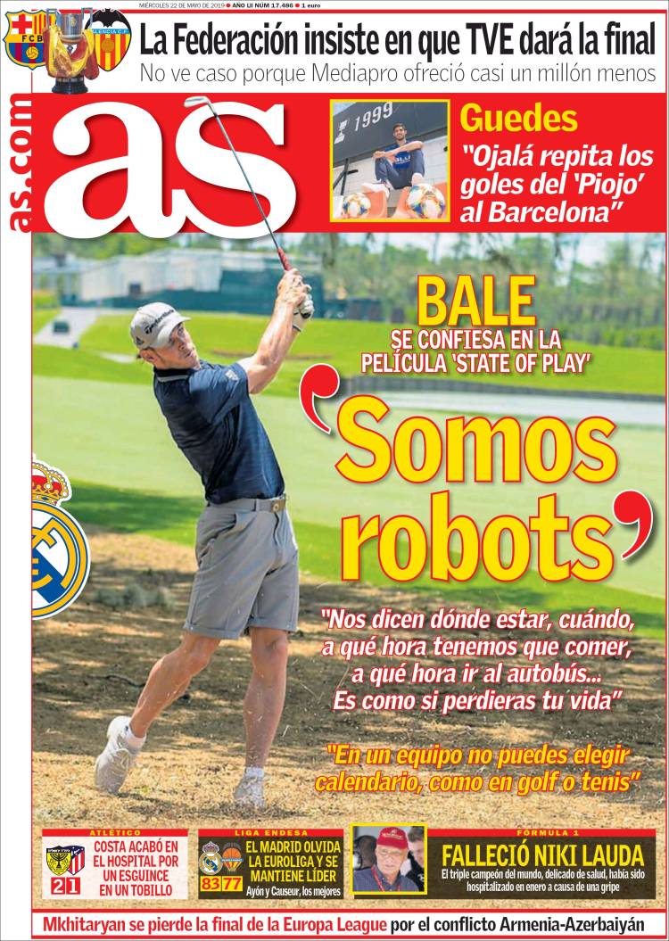 Gareth Bale reveló que la vida de un futbolista es difícil, es vivir como un robot. (As) Pumas sería rebasado en títulos por León y alcanzado por Tigres, esto dependiendo que equipo salga campeón. (Cancha) Juan Escobar se convertiría en el primer refuerzo de Cruz Azul, proveniente del Cerro Porteño de Paraguay. (Esto) Raphaël Varane confirmó su permanencia en el Real Madrid. (Marca) Ivan Rakitić quiere continuar en el Barça y le gustaría jugar con Antoine Griezmann. (Mundo Deportivo) Sergio Conceicao podrá estar presente en la Final de la Copa de Portugal. (O Jogo) Jérémy Mathieu renovó con el Sporting de Lisboa y Jasper Cillessen continúa siendo el arquero favorito para arribar al equipo de los Leones. (Record) Paul Pogba estuvo en Turín el pasado fin de semana en una fiesta de Andrea Barzagli. (Tuttosport) Niki Lauda falleció esta semana y este diario francés le dedicó la portada. (L’Equipe) El Barcelona quiere a Matthijs de Ligt pero lo que ha detenido las negociaciones sería el salario del jugador. (Sport) Sporting de Lisboa espera cerrar esta semana el fichaje de Jasper Cillessen. (A Bola) José Juan Macías quiere ganar si o sí el Mundial Sub 20. (Récord)Relacionado