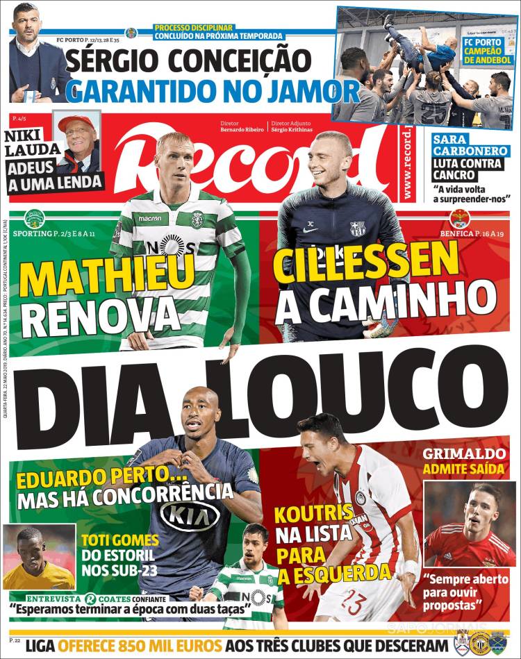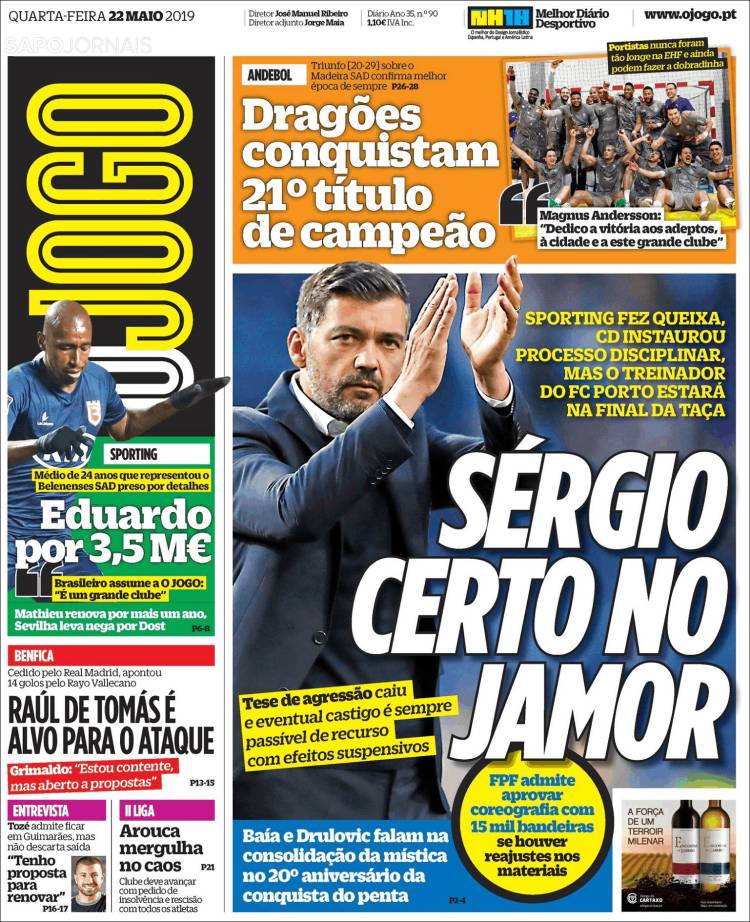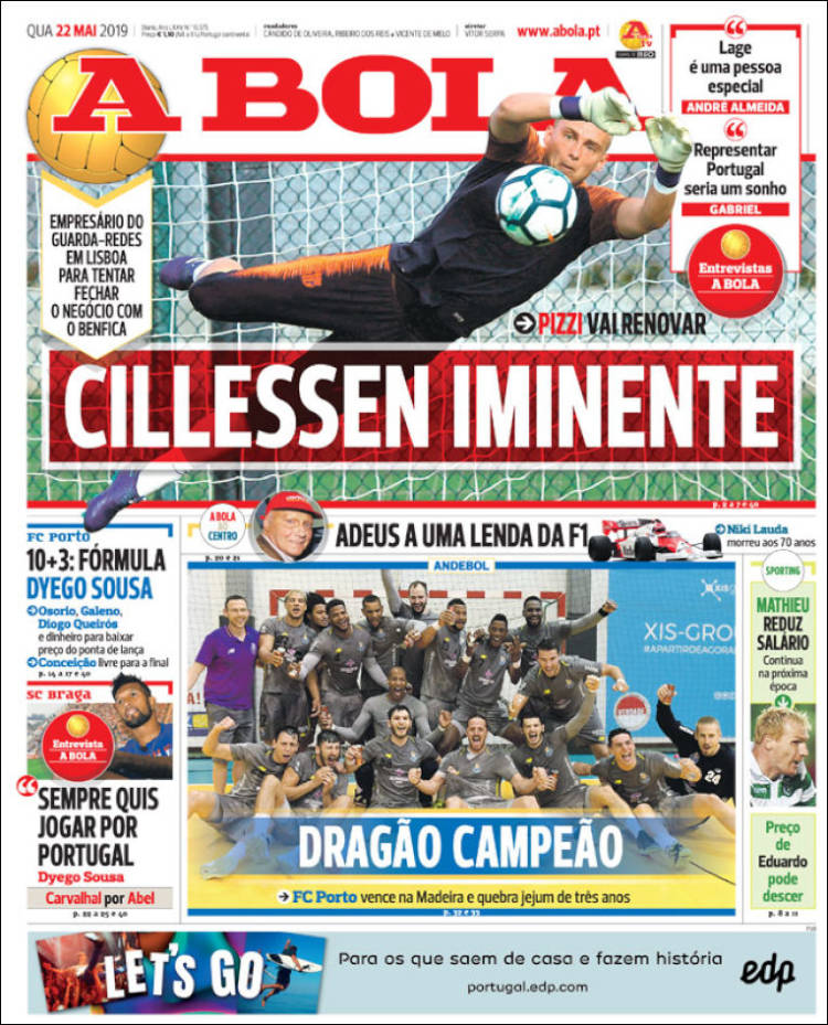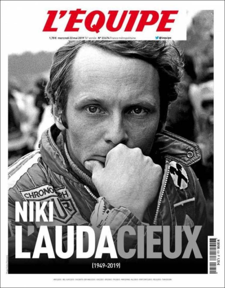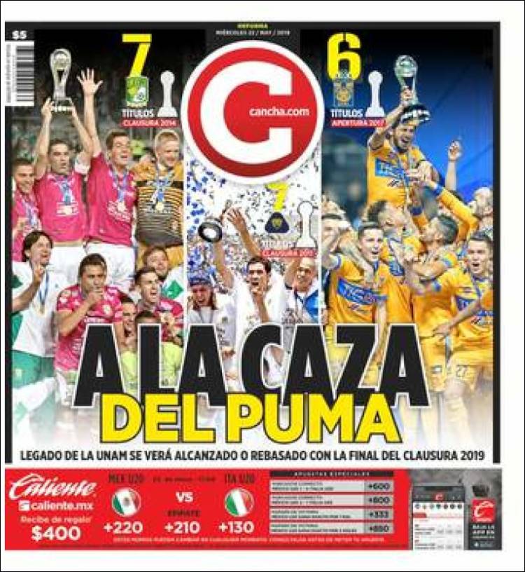 Gareth Bale reveló que la vida de un futbolista es difícil, es vivir como un robot. (As) Pumas sería rebasado en títulos por León y alcanzado por Tigres, esto dependiendo que equipo salga campeón. (Cancha) Juan Escobar se convertiría en el primer refuerzo de Cruz Azul, proveniente del Cerro Porteño de Paraguay. (Esto) Raphaël Varane confirmó su permanencia en el Real Madrid. (Marca) Ivan Rakitić quiere continuar en el Barça y le gustaría jugar con Antoine Griezmann. (Mundo Deportivo) Sergio Conceicao podrá estar presente en la Final de la Copa de Portugal. (O Jogo) Jérémy Mathieu renovó con el Sporting de Lisboa y Jasper Cillessen continúa siendo el arquero favorito para arribar al equipo de los Leones. (Record) Paul Pogba estuvo en Turín el pasado fin de semana en una fiesta de Andrea Barzagli. (Tuttosport) Niki Lauda falleció esta semana y este diario francés le dedicó la portada. (L’Equipe) El Barcelona quiere a Matthijs de Ligt pero lo que ha detenido las negociaciones sería el salario del jugador. (Sport) Sporting de Lisboa espera cerrar esta semana el fichaje de Jasper Cillessen. (A Bola) José Juan Macías quiere ganar si o sí el Mundial Sub 20. (Récord)Relacionado